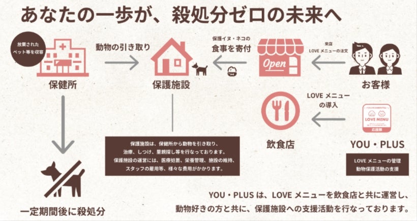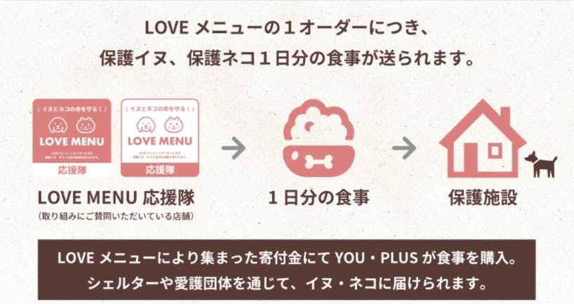 YOU・PLUSでは、動物たちの命を救いたい!何かできることをやりたい!という方のために、もっと気軽に動物たちの命を守る活動に参加いただける方法として、『LOVEメニュー』企画を実施しています。