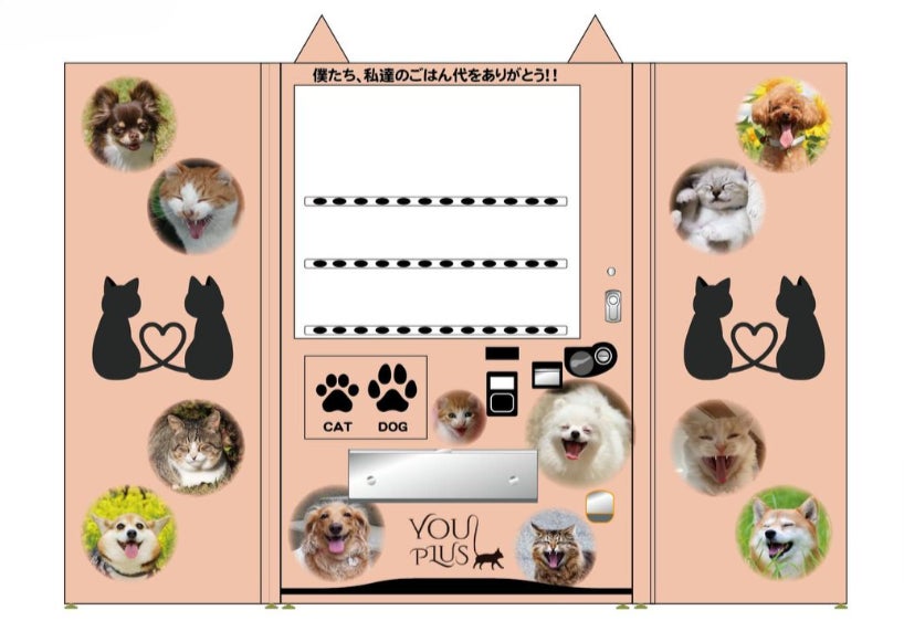 YOU・PLUSと大手飲料メーカーのコラボ自販機を設置予定です。そこで、自販機に皆さまのネコちゃん・ワンちゃんの顔写真を掲載いただく権利もリターンとしてご用意しました!