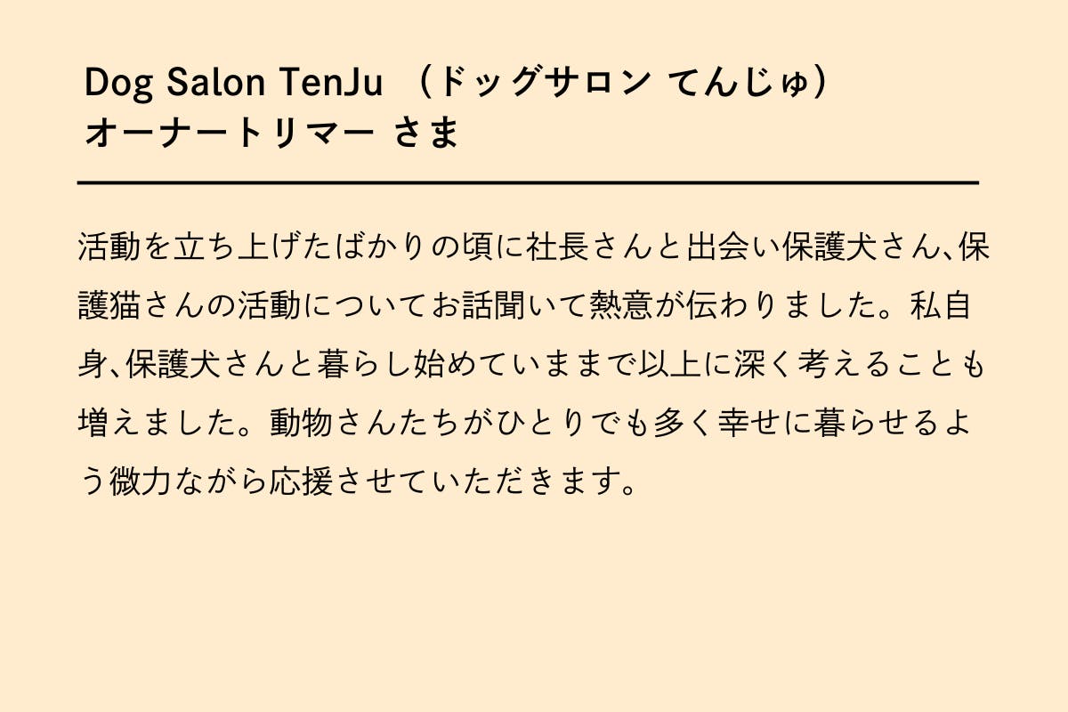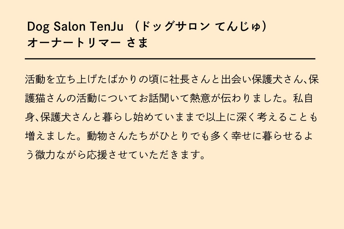 私たちは、保護イヌ・保護ネコの支援活動を通じて、皆さまにもう一度命の大切さを考えていただくとともに、このプロジェクトを通じて、動物も人も豊かで幸せに暮らせる未来を創っていきたいと考えております!