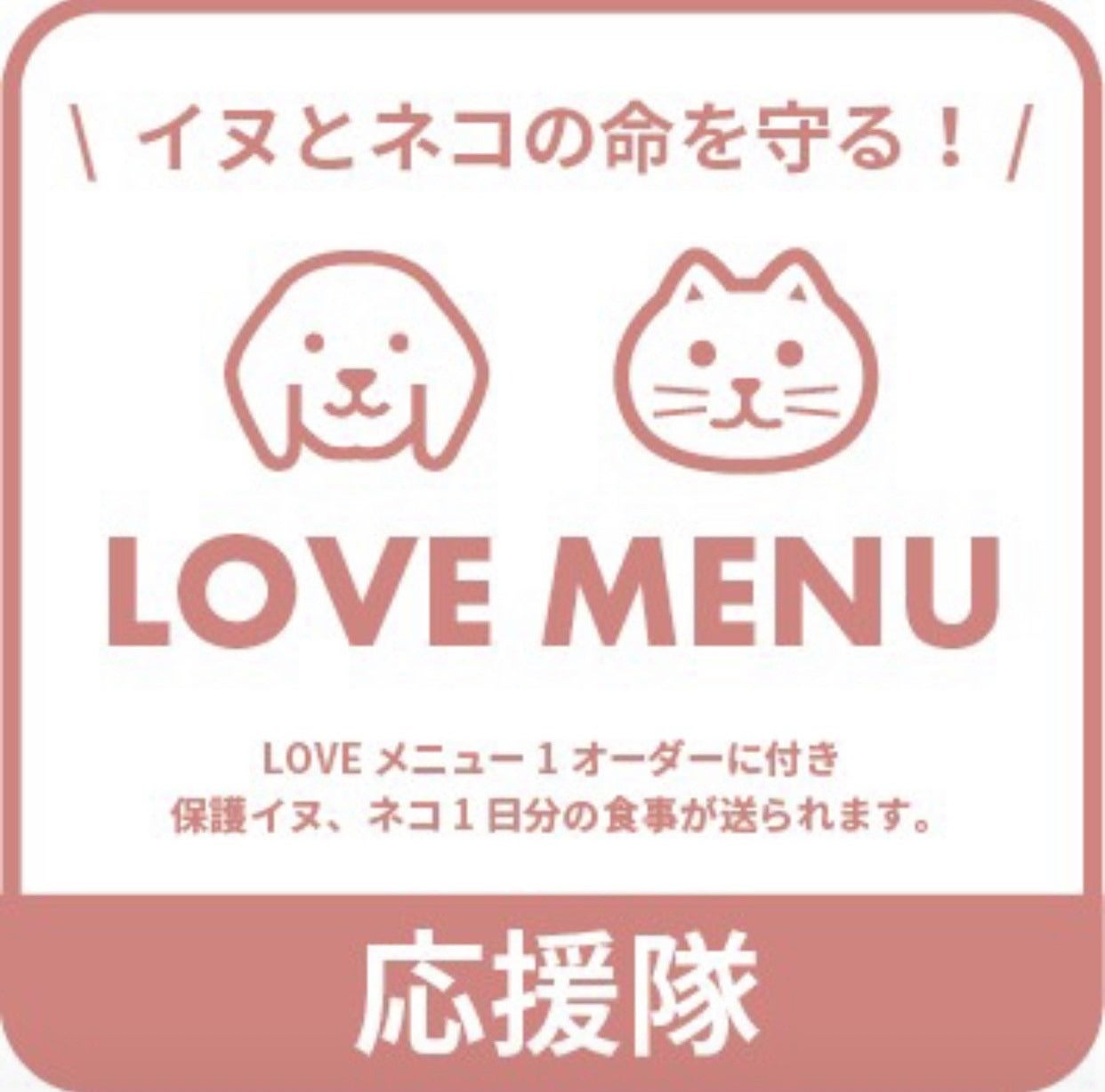 LOVEメニュー企画は、「食べてご飯を寄付する」という、自分が食べた分で支援できるシンプルな方法なため、誰でもネコちゃん・ワンちゃんたちの命を救う活動に参加することができます。