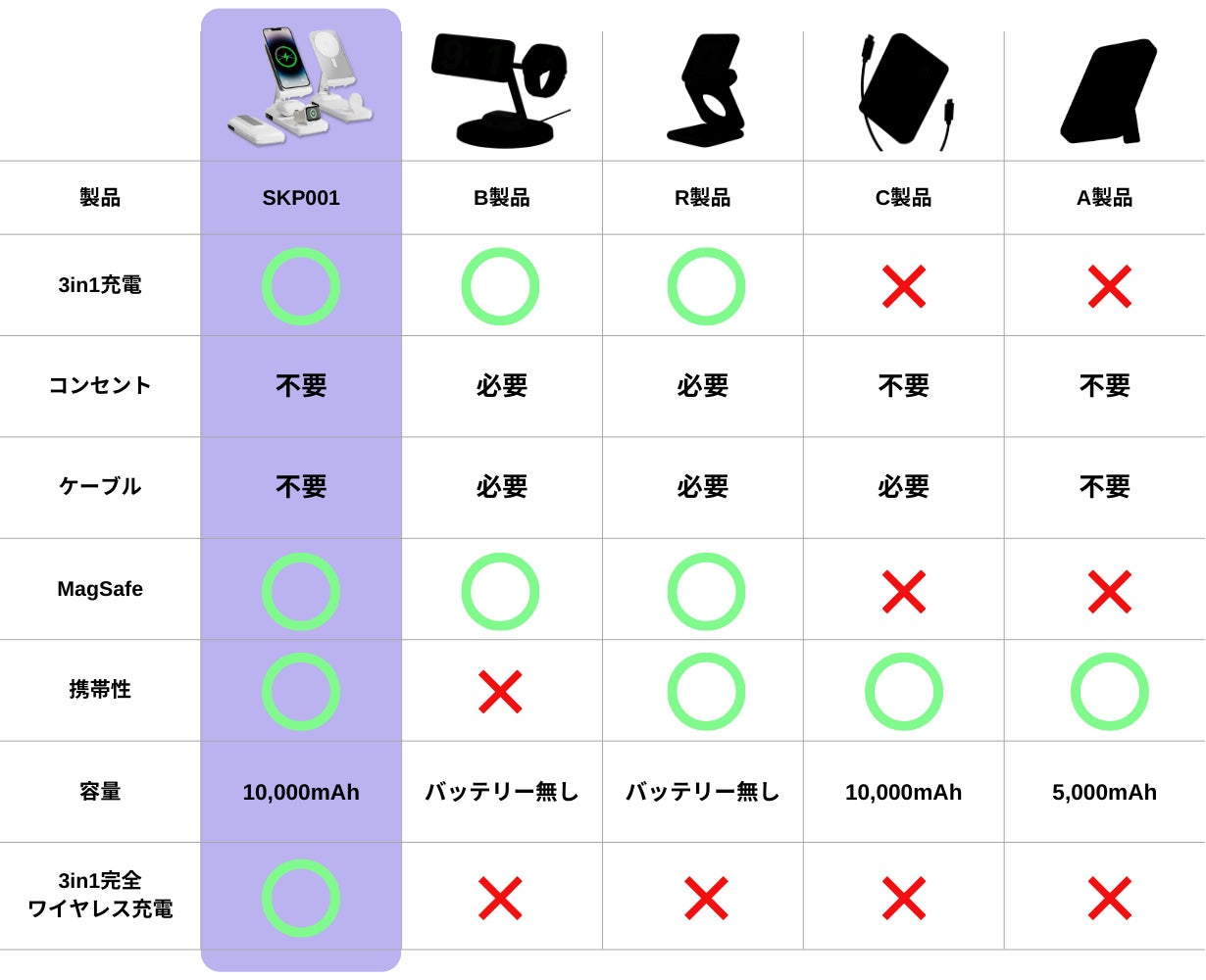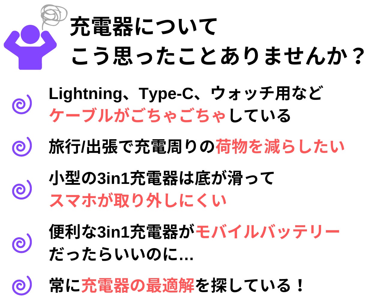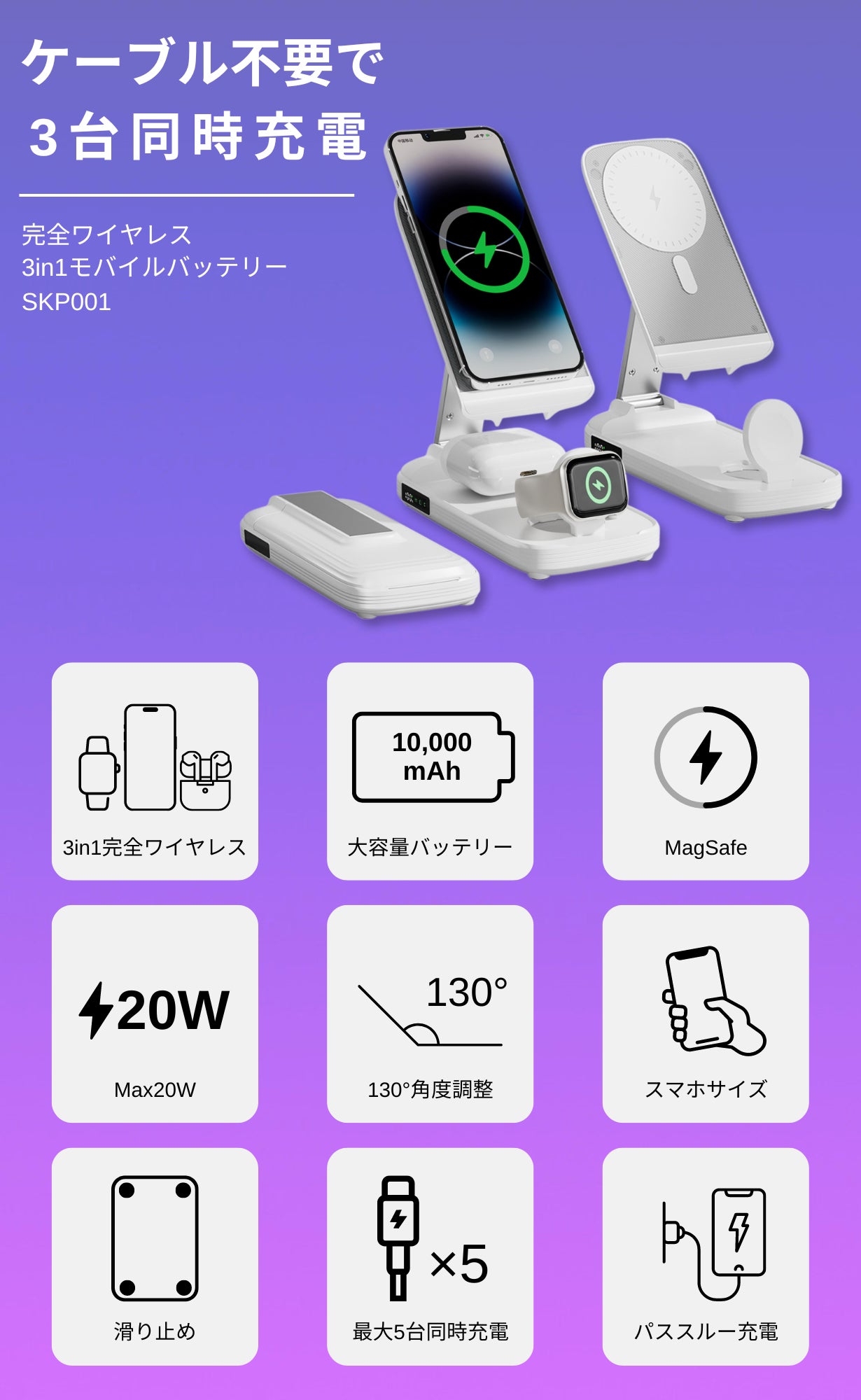 実際にあった充電器の悩みや期待を収集し、見事に解決したのが、「SKP001」完全ワイヤレス3in1モバイルバッテリーです。