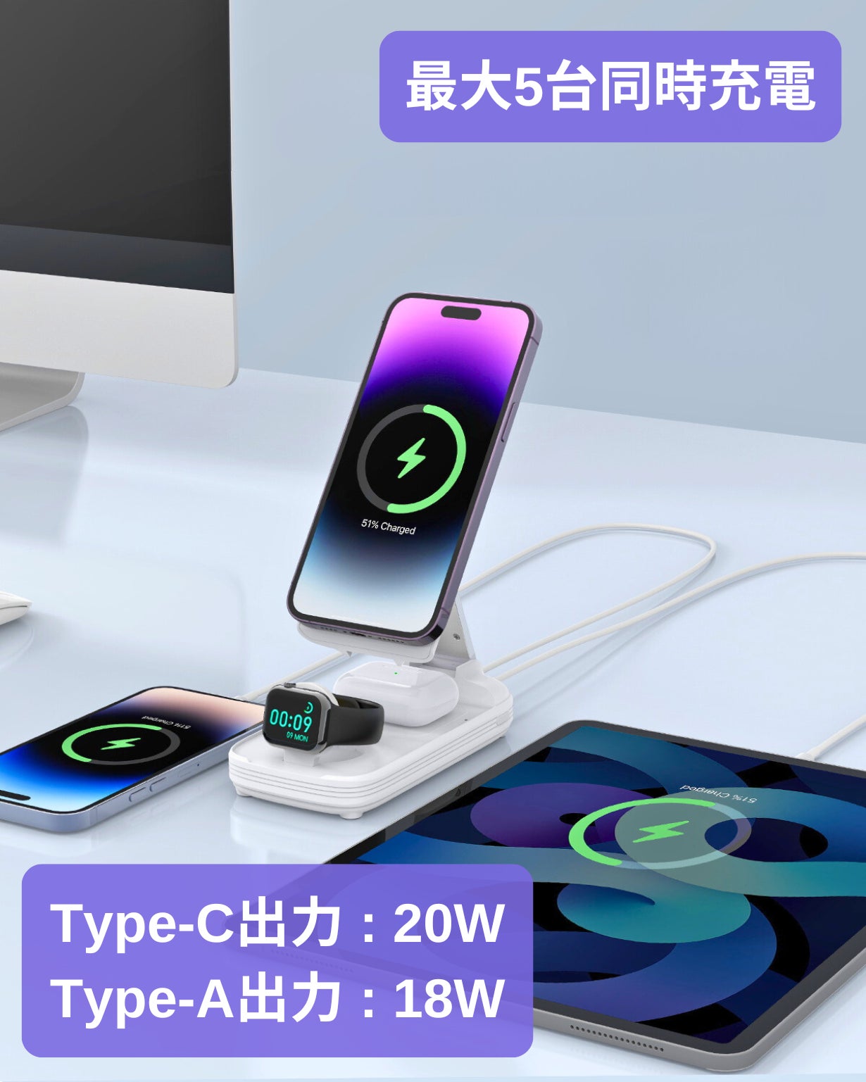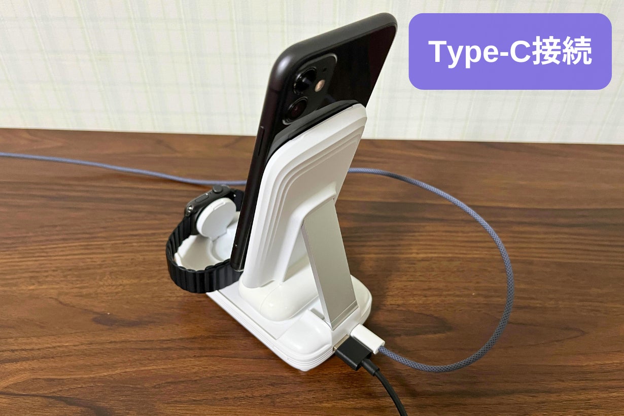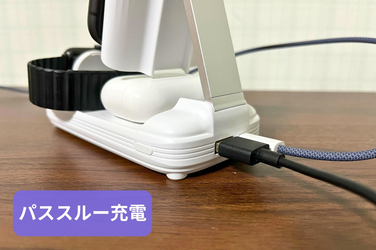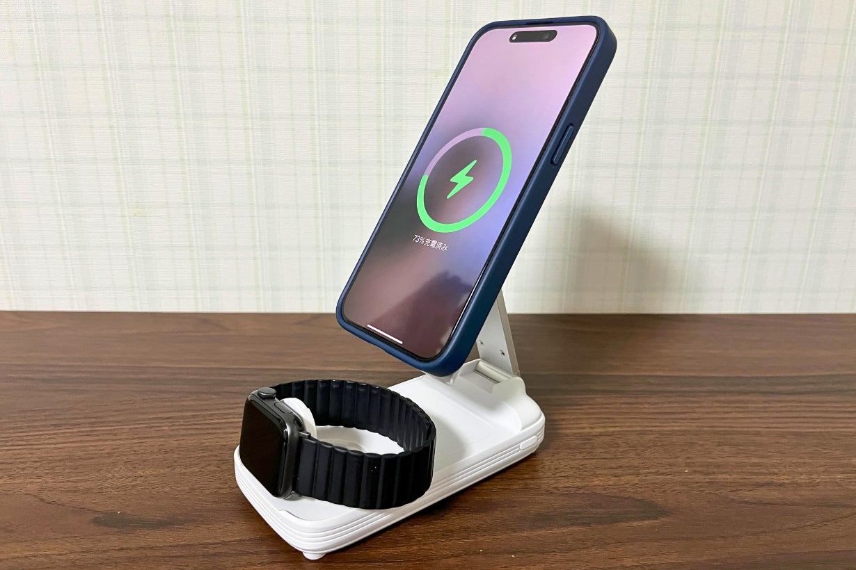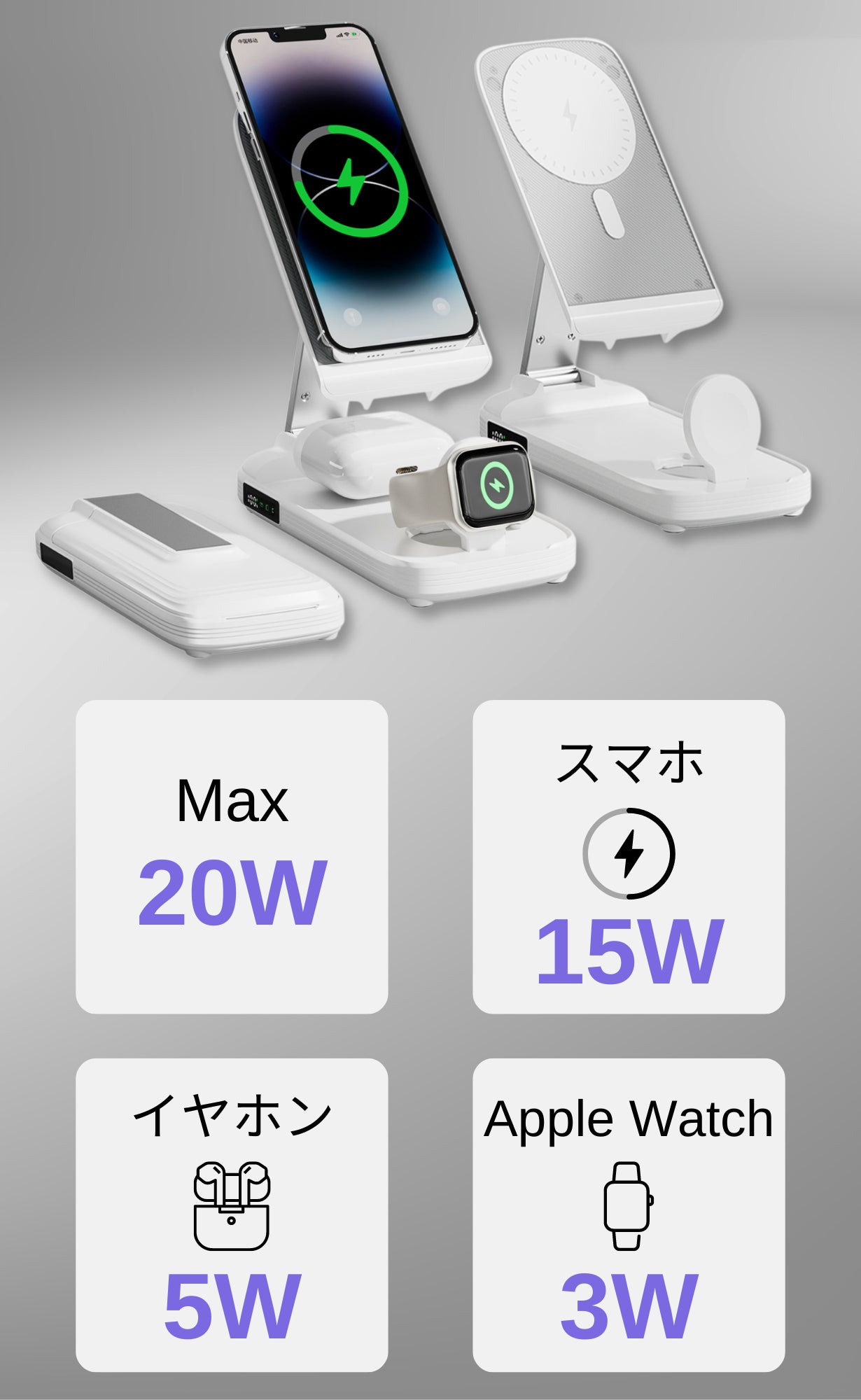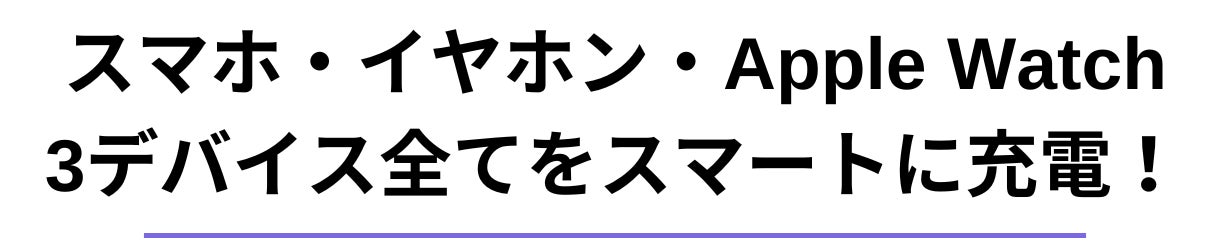 ワイヤレス充電の最大出力は20W。スマホ、イヤホン、Apple Watchを3台まとめて急速充電できます。