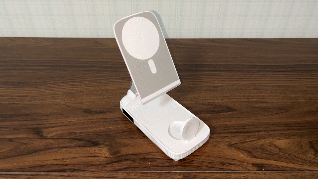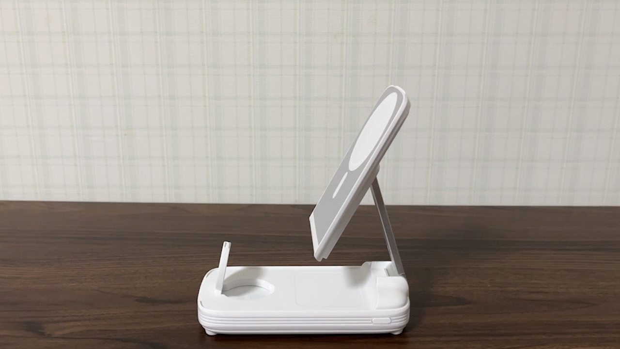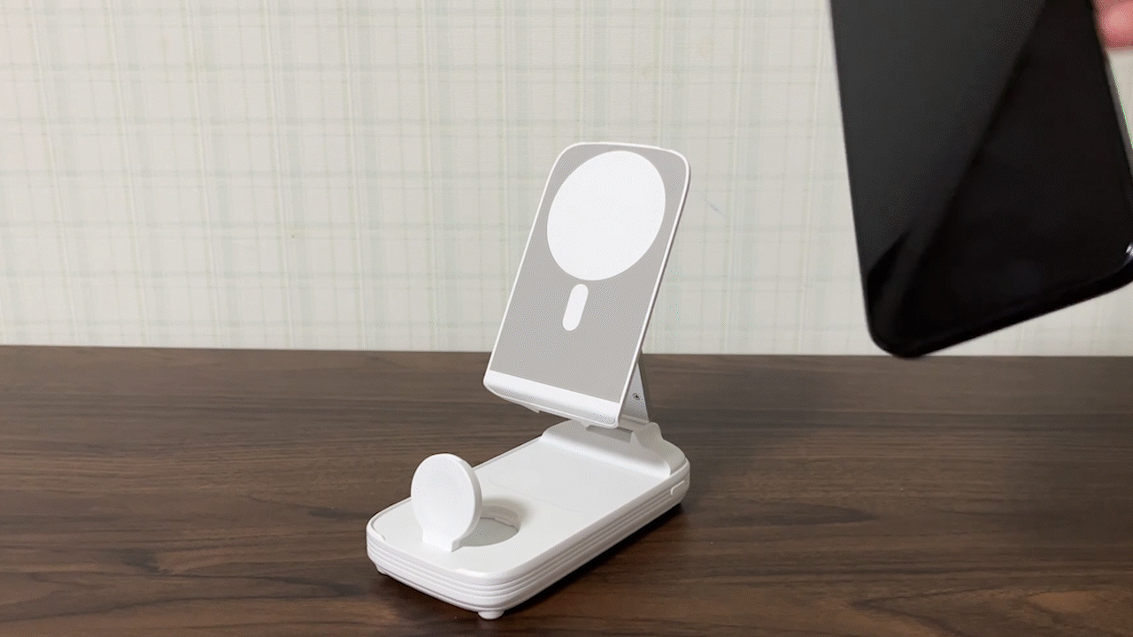 本体は折りたたみ式で、使わないときはスマホサイズまでコンパクトになります。小さなカバンにもすっぽり入るので、完全ワイヤレス充電との相性は抜群です。