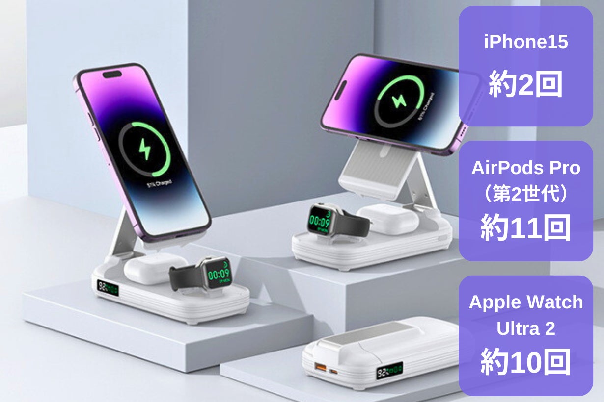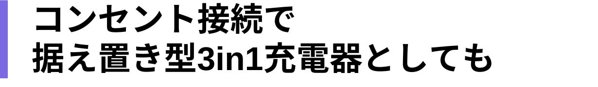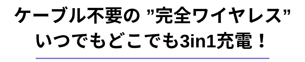 3in1充電器にバッテリーを搭載したことで、ケーブルレスでの3台同時ワイヤレス充電を実現しました。コンセントがない場所でもバッチリ充電できるので、旅行や出張にピッタリです。