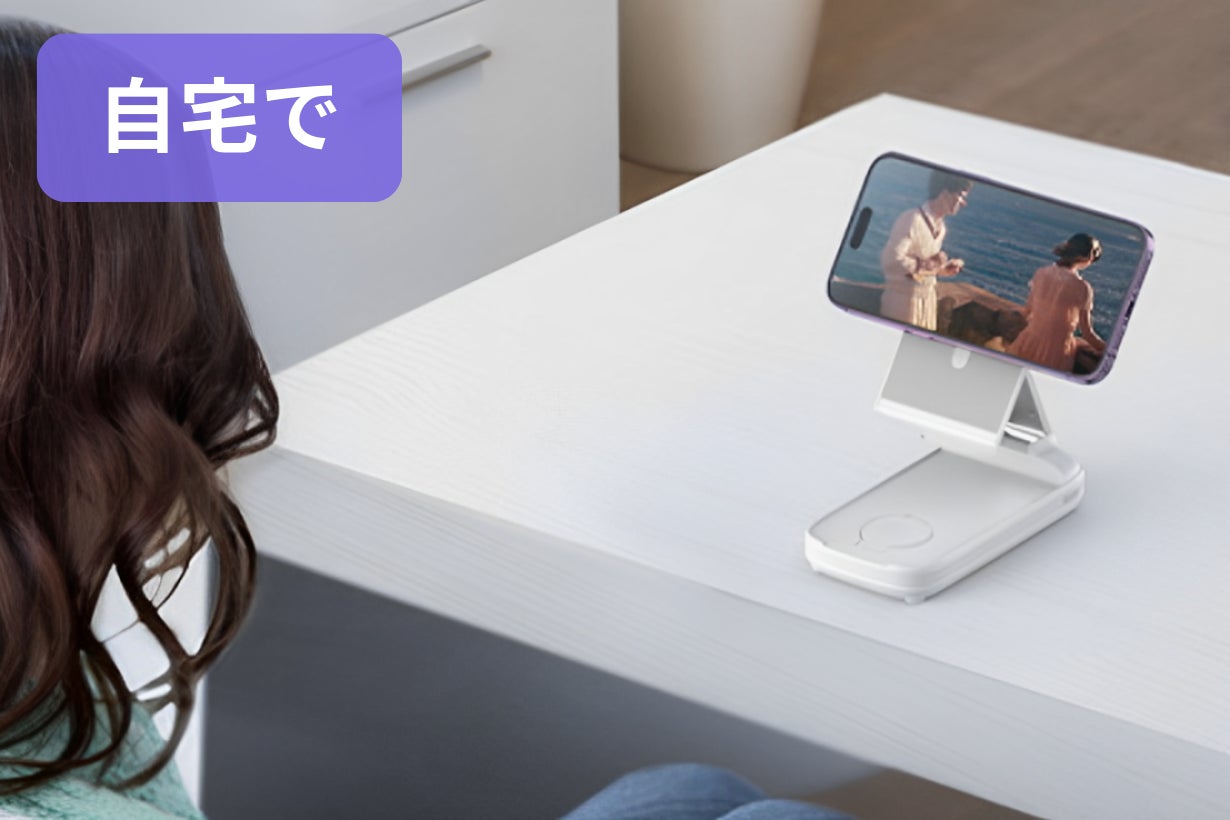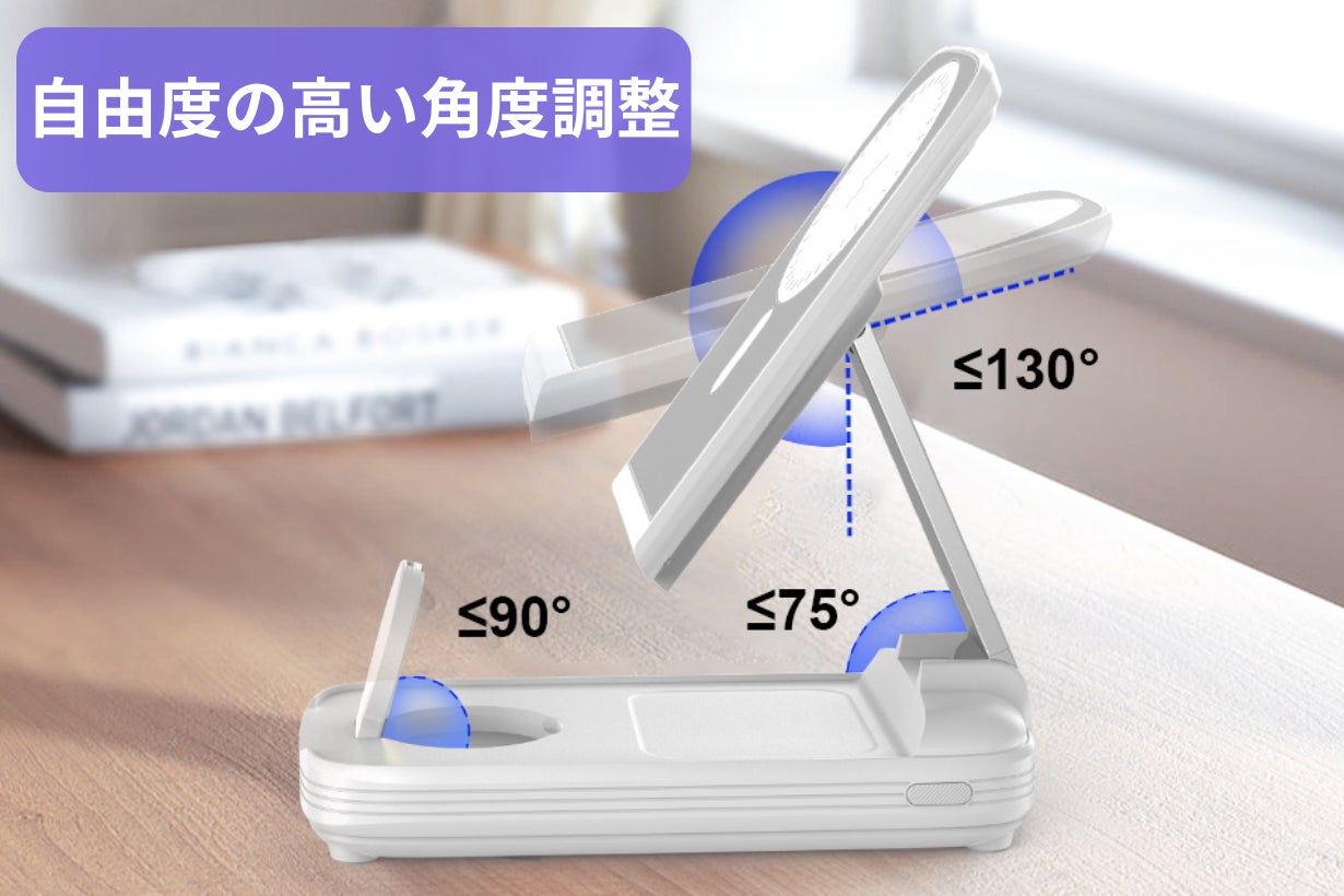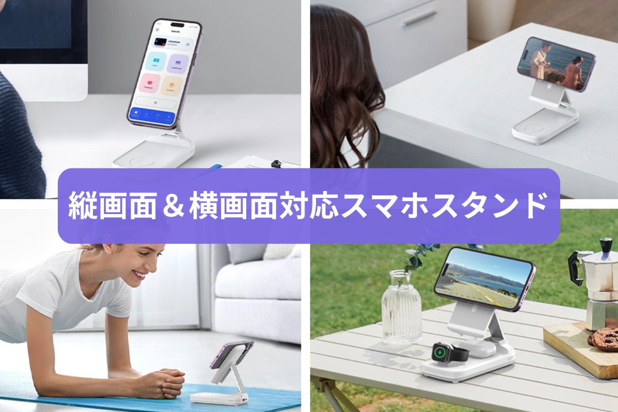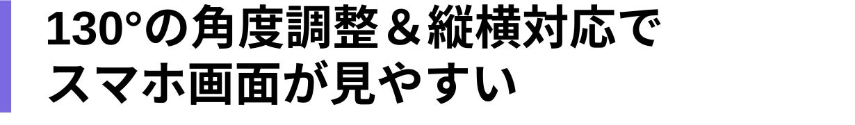 広角に角度調整でき、縦画面でも横画面でもスマホを吸着。動画を楽しんだり、PCの横に置いてスマホをサブモニターにしたり、幅広く活躍する機能です。