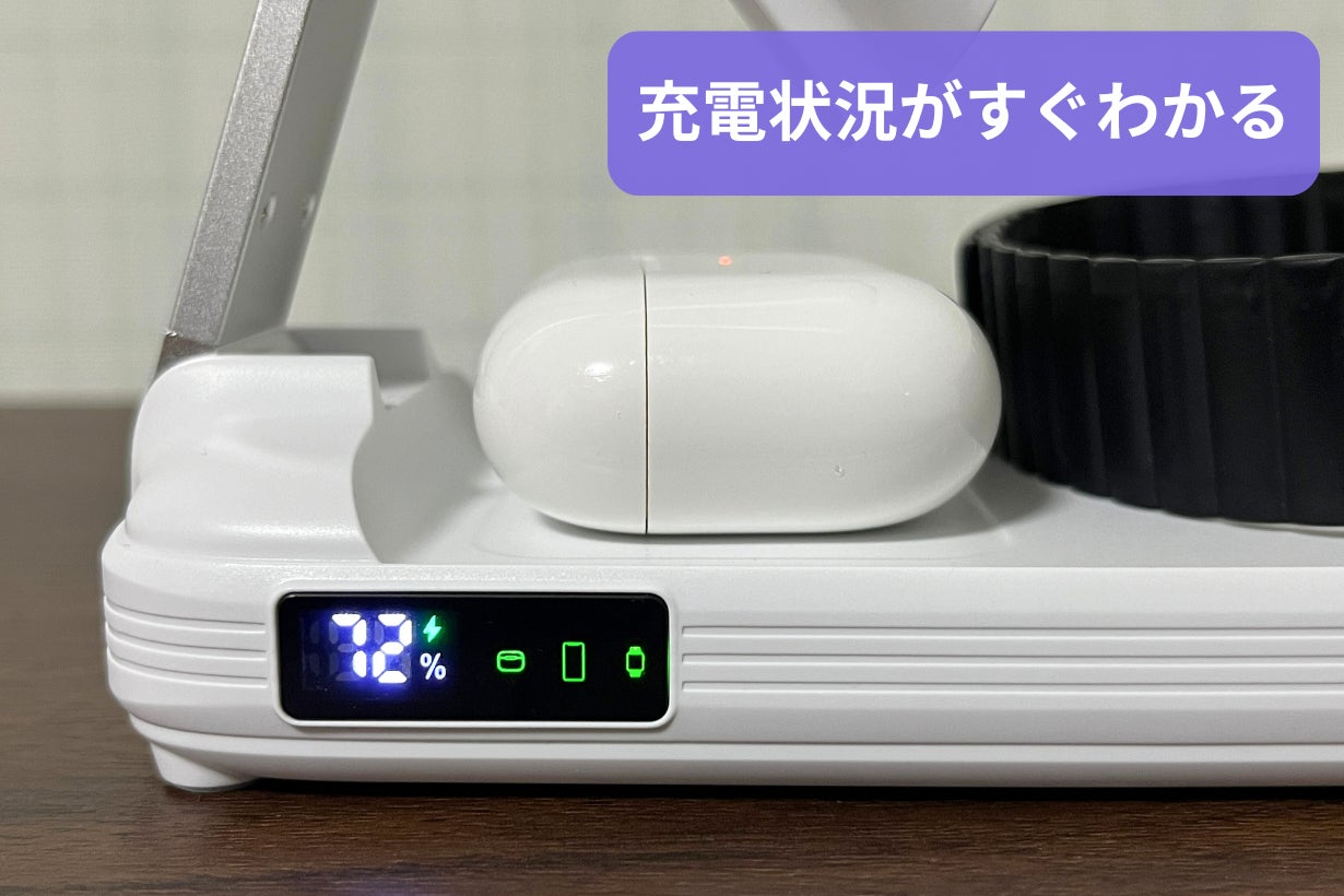 側面のLEDディスプレイには、バッテリー残量が表示されるので、残量がなくなったタイミングで本体充電できます。また、充電しているデバイスは緑色のアイコンで表示されるので、「ちゃんと充電できてる?」といったワイヤレス充電の不安も解消できます。