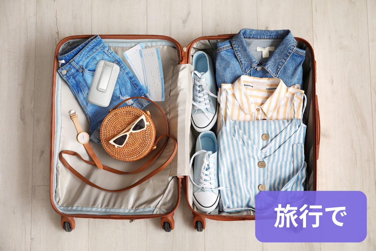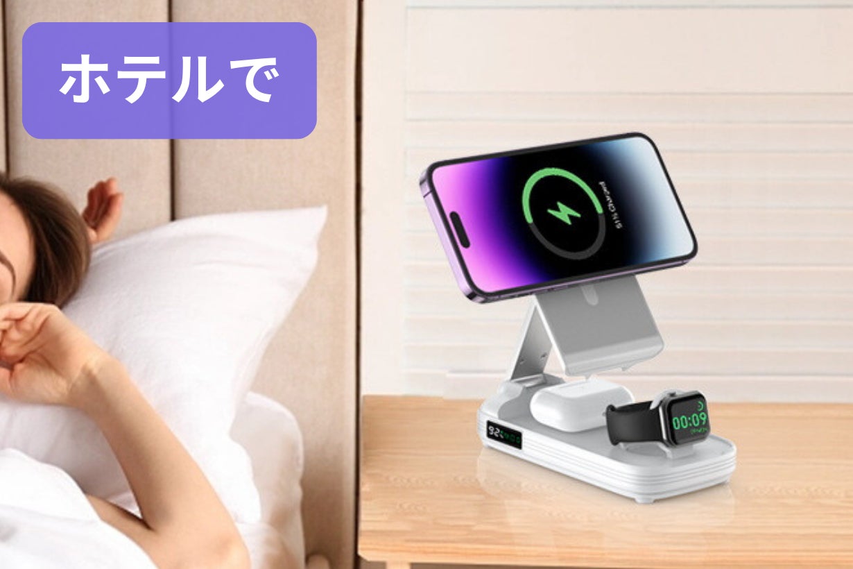 旅行や出張で外出しているときはモバイルバッテリーとして「完全ワイヤレス」で充電し、ホテルに帰ったらコンセントに接続してスマホなどを充電できます。