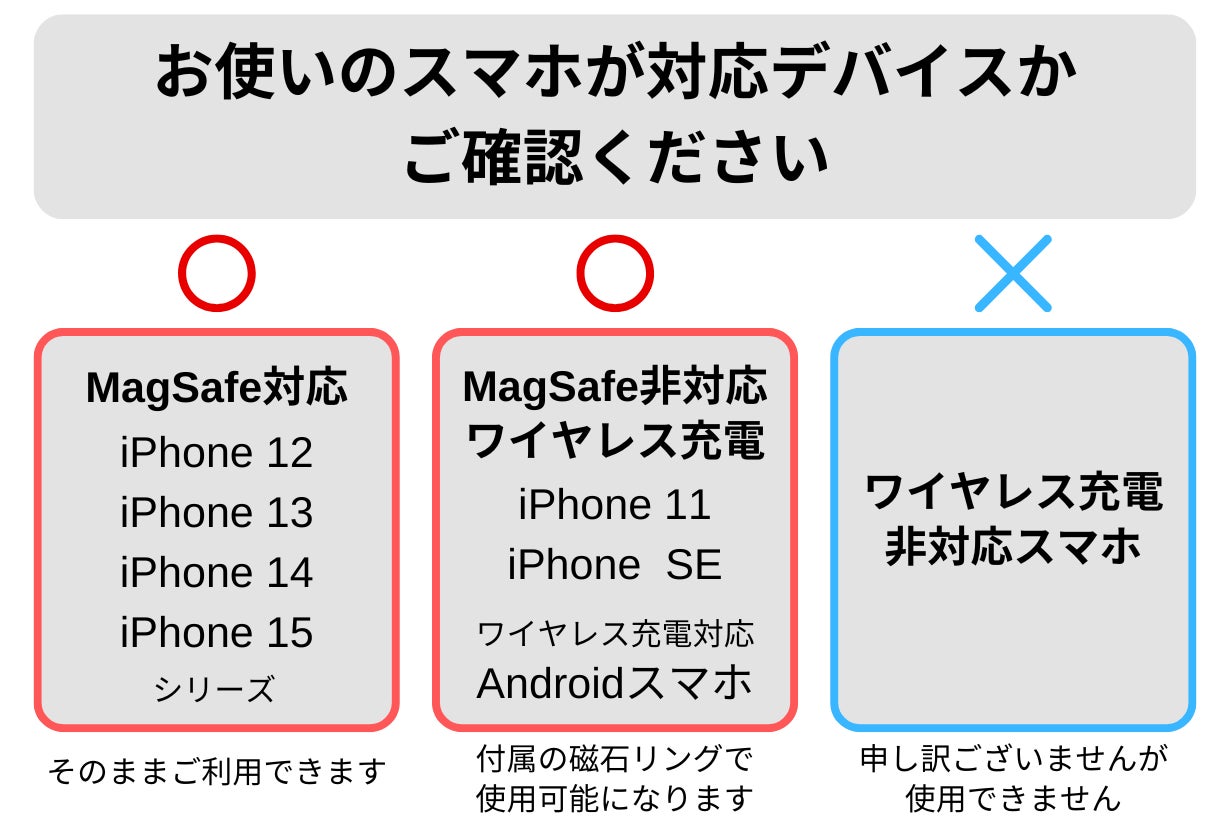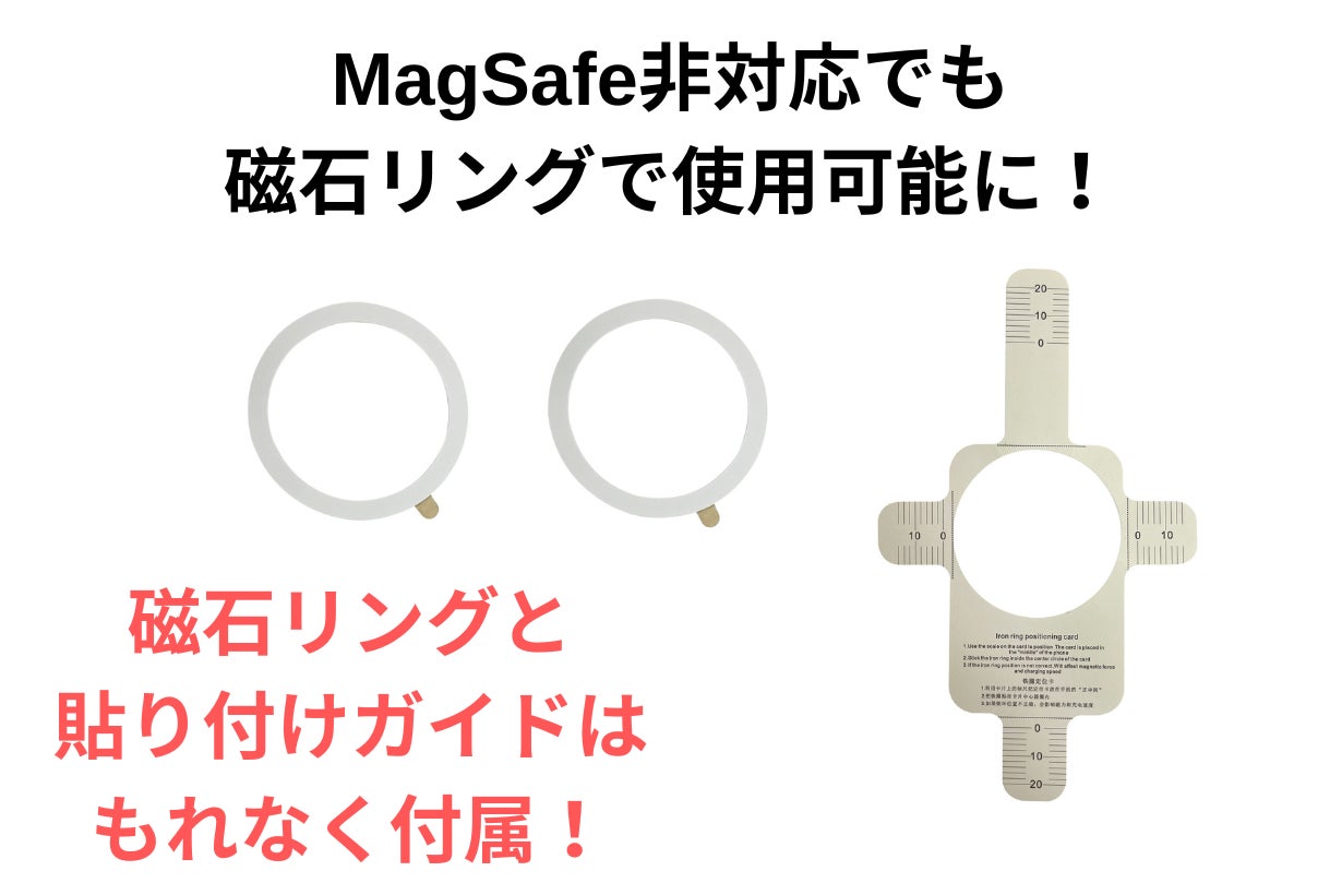 Q. MagSafe未対応のスマホにも使えますか?A. ワイヤレス充電に対応しているスマホであれば、付属の磁石リングをスマホ背面に貼ることで使用可能になります。