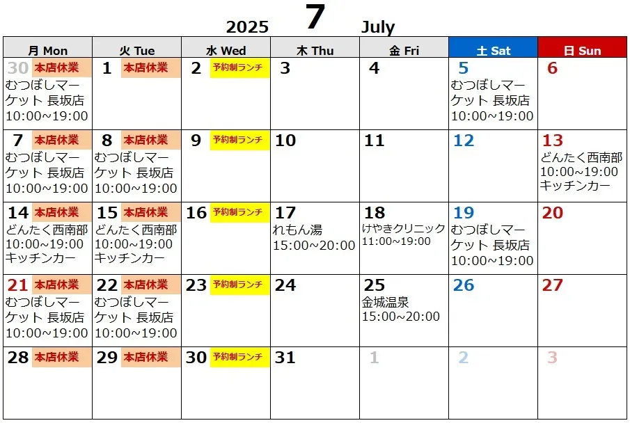 新着情報:春巻き専門店はるまき家の2025年7月の日程表が更新されました