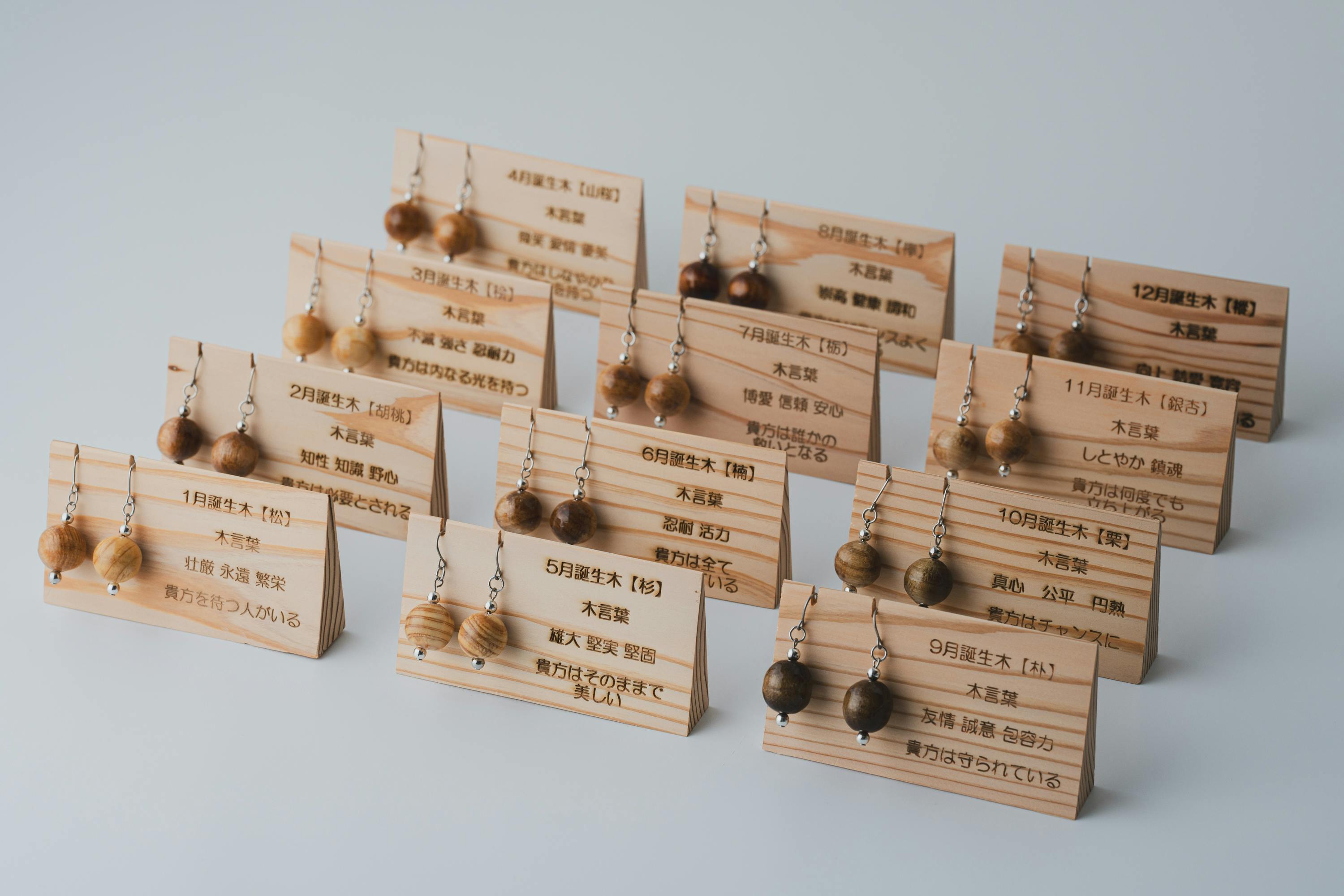 例えば、松(1月)は「壮厳」、胡桃(2月)は「知性」といった木言葉があり、それぞれの木が持つエネルギーを身につけることで、運気を上げたい方にとって心強いお守りとなります。