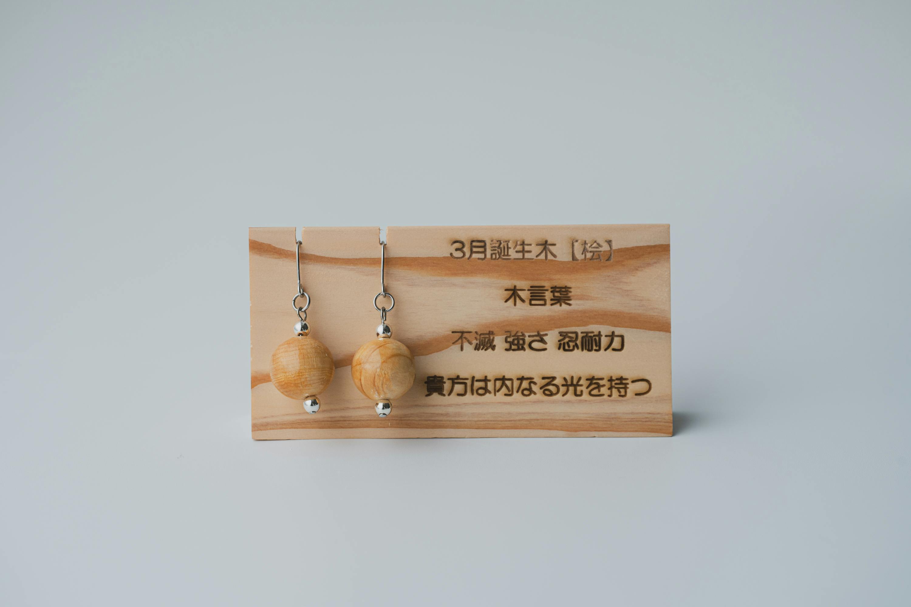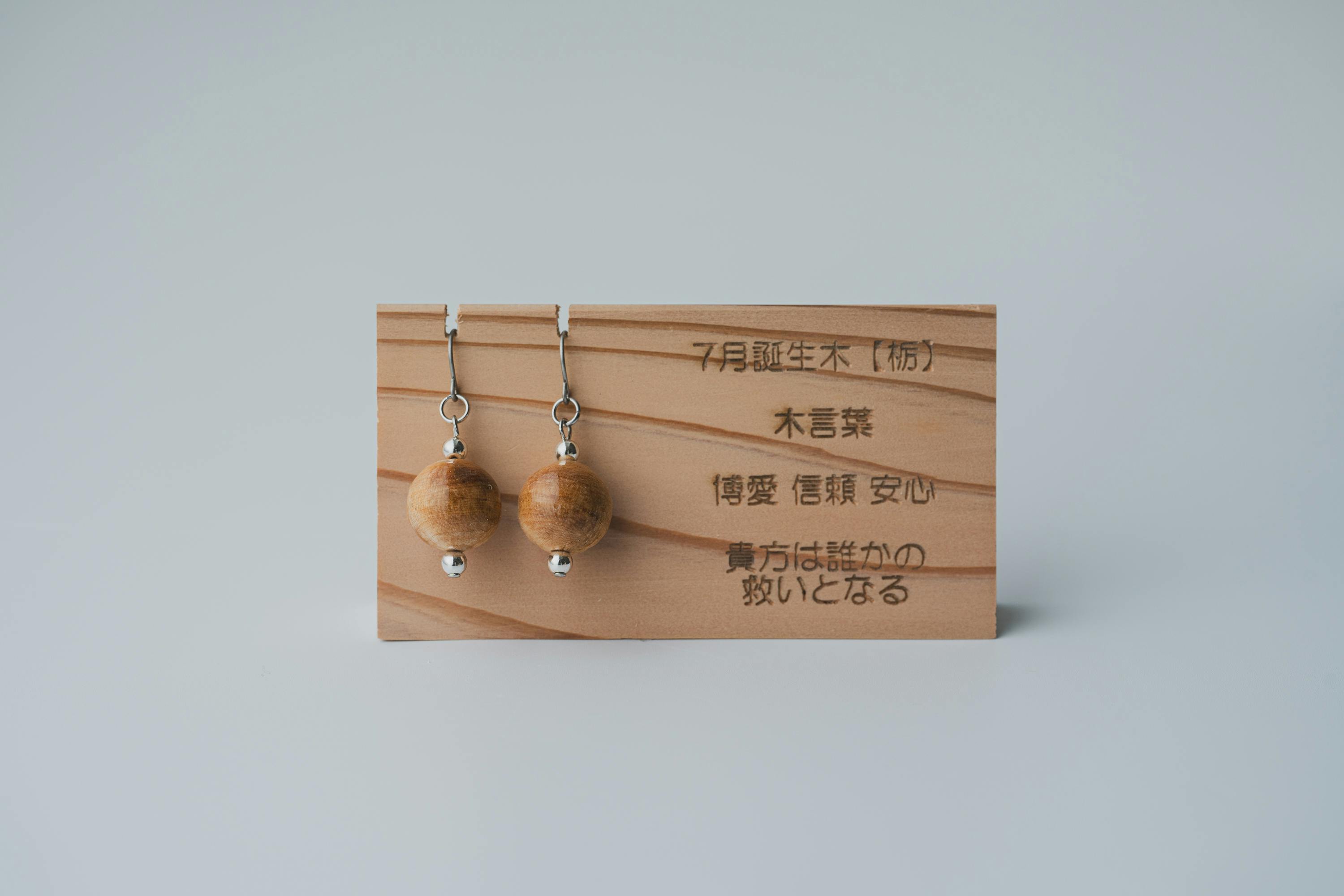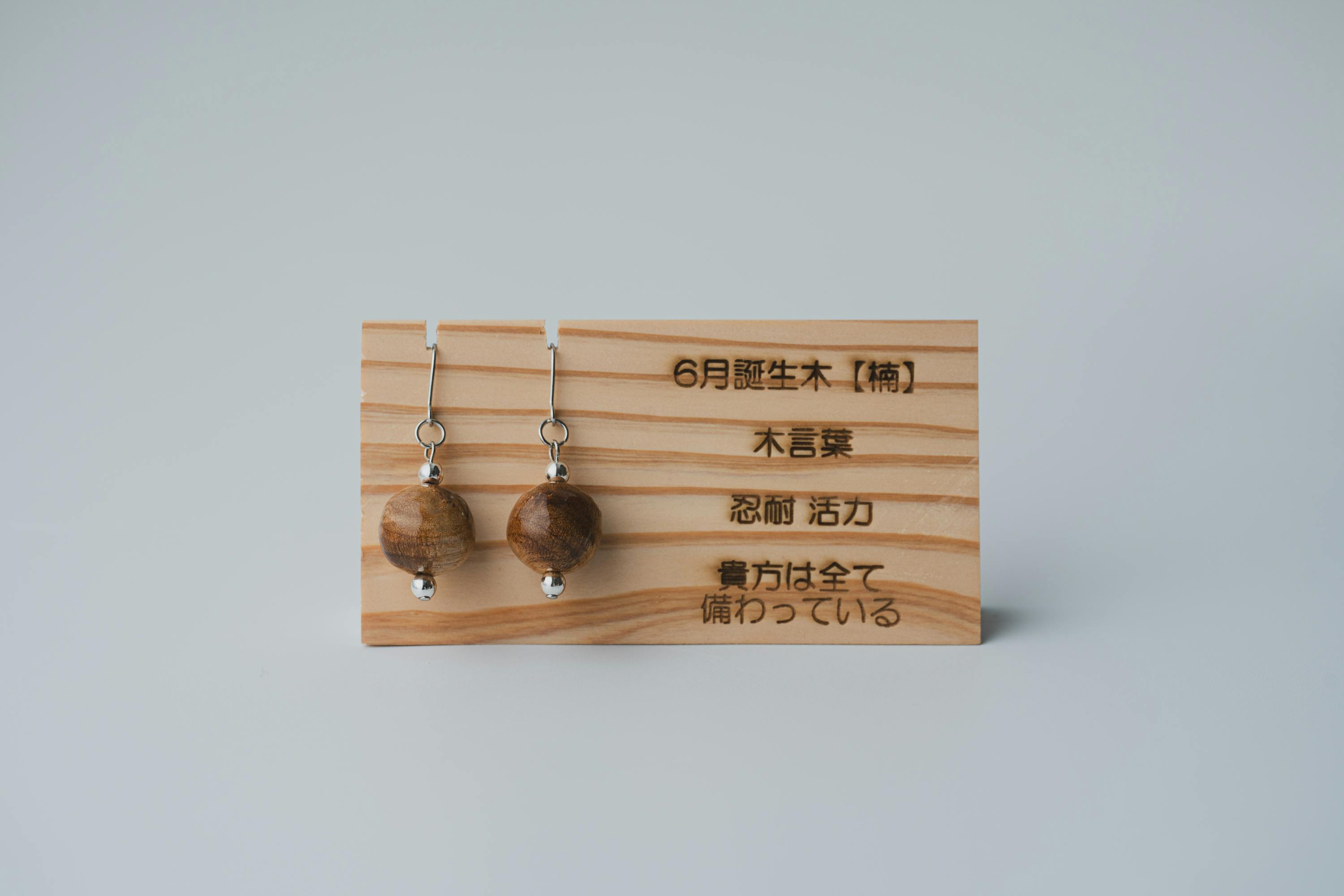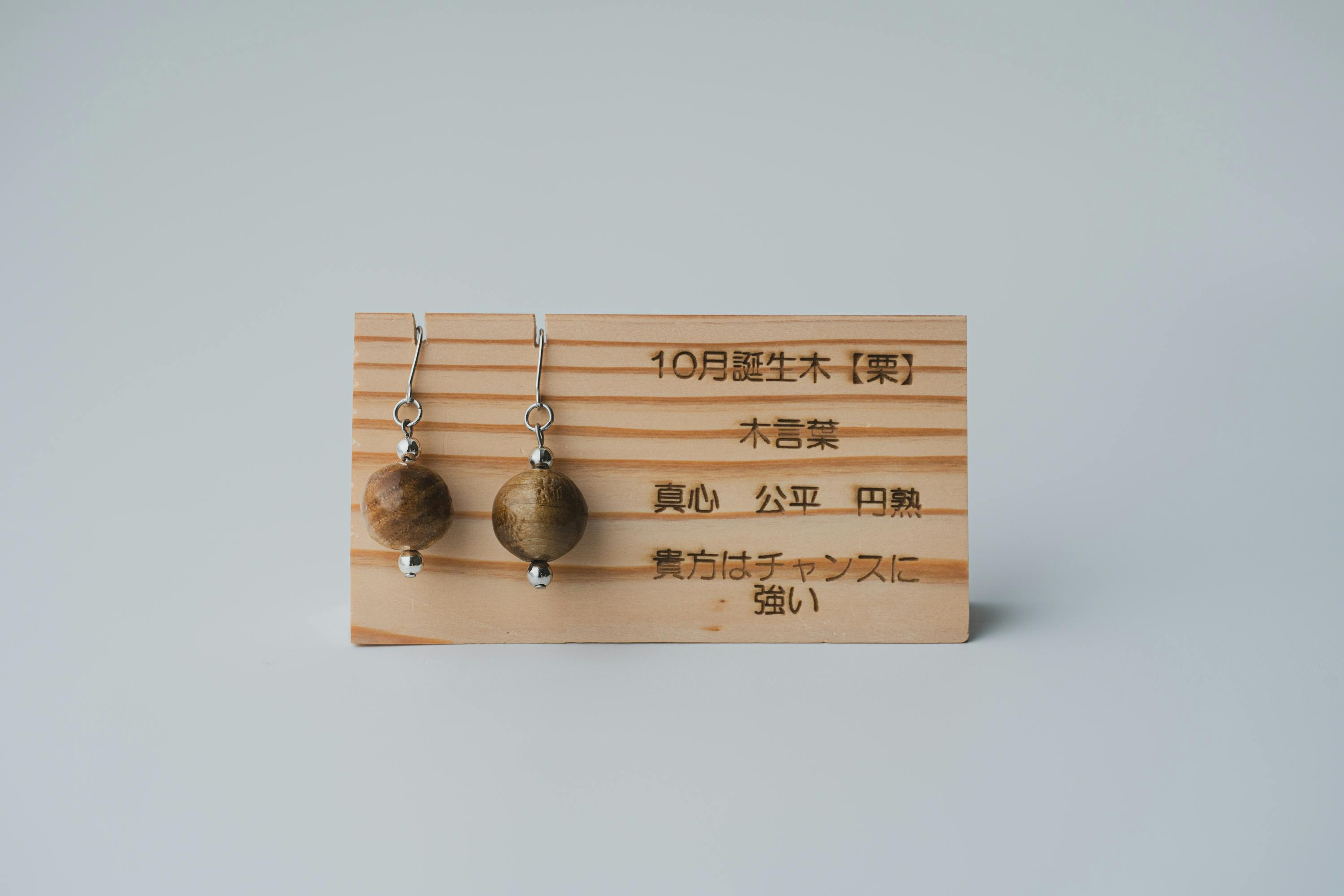それぞれの生まれ月に対応した12種類の守り木(誕生木)を使用して、シンプルで温かみのあるピアス/イヤリングに仕上げています。