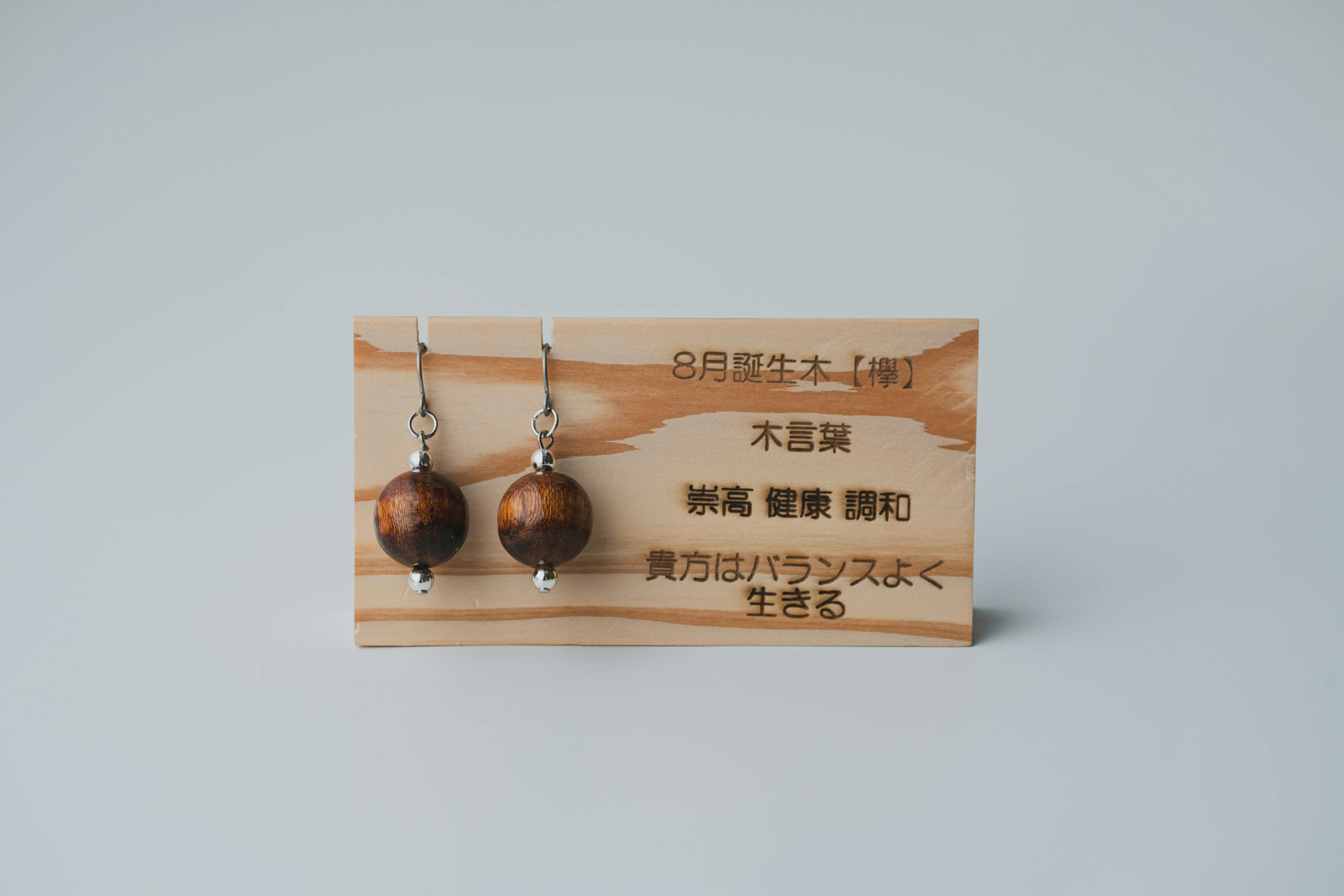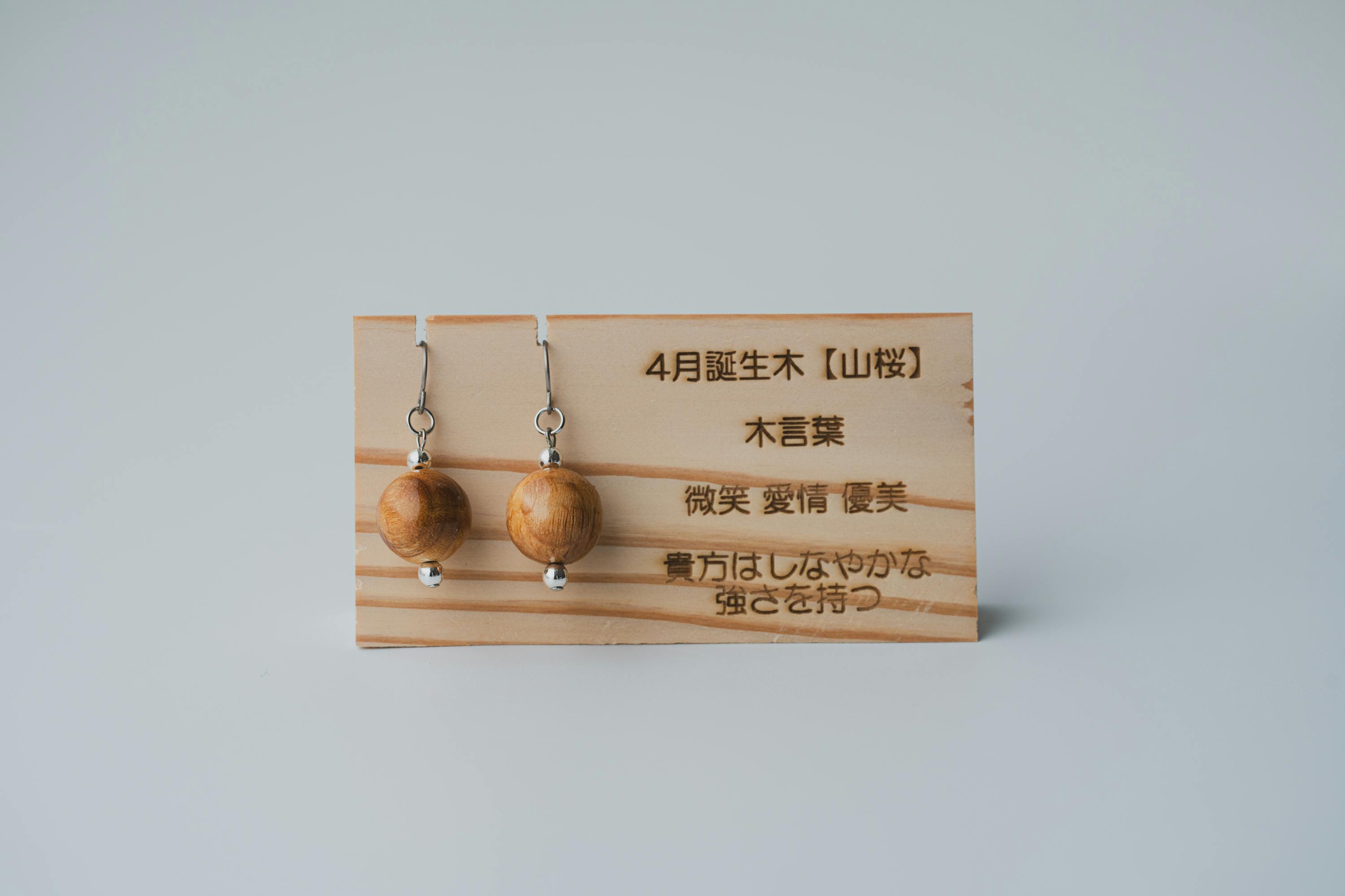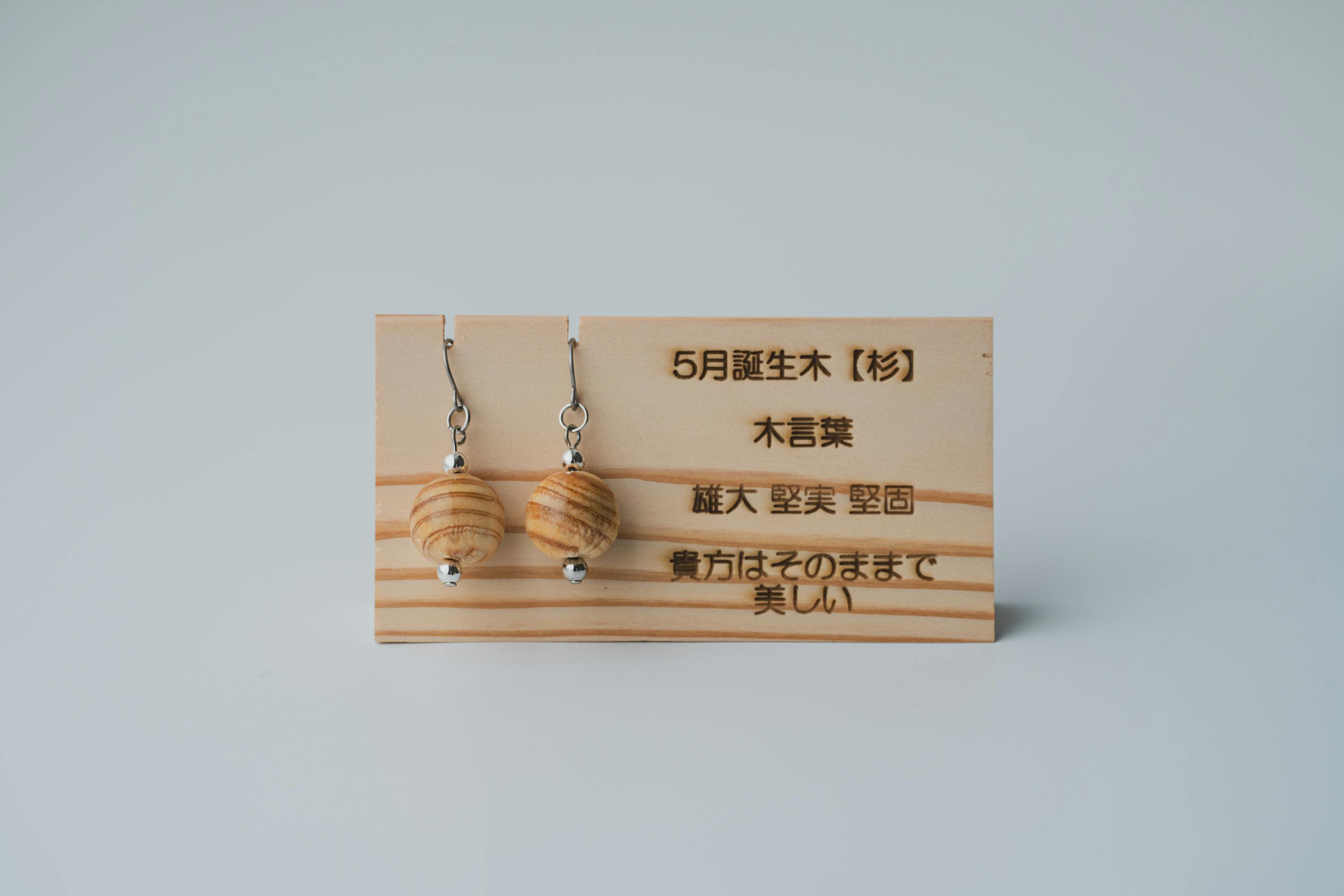 それぞれの生まれ月に対応した12種類の守り木(誕生木)を使用して、シンプルで温かみのあるピアス/イヤリングに仕上げています。