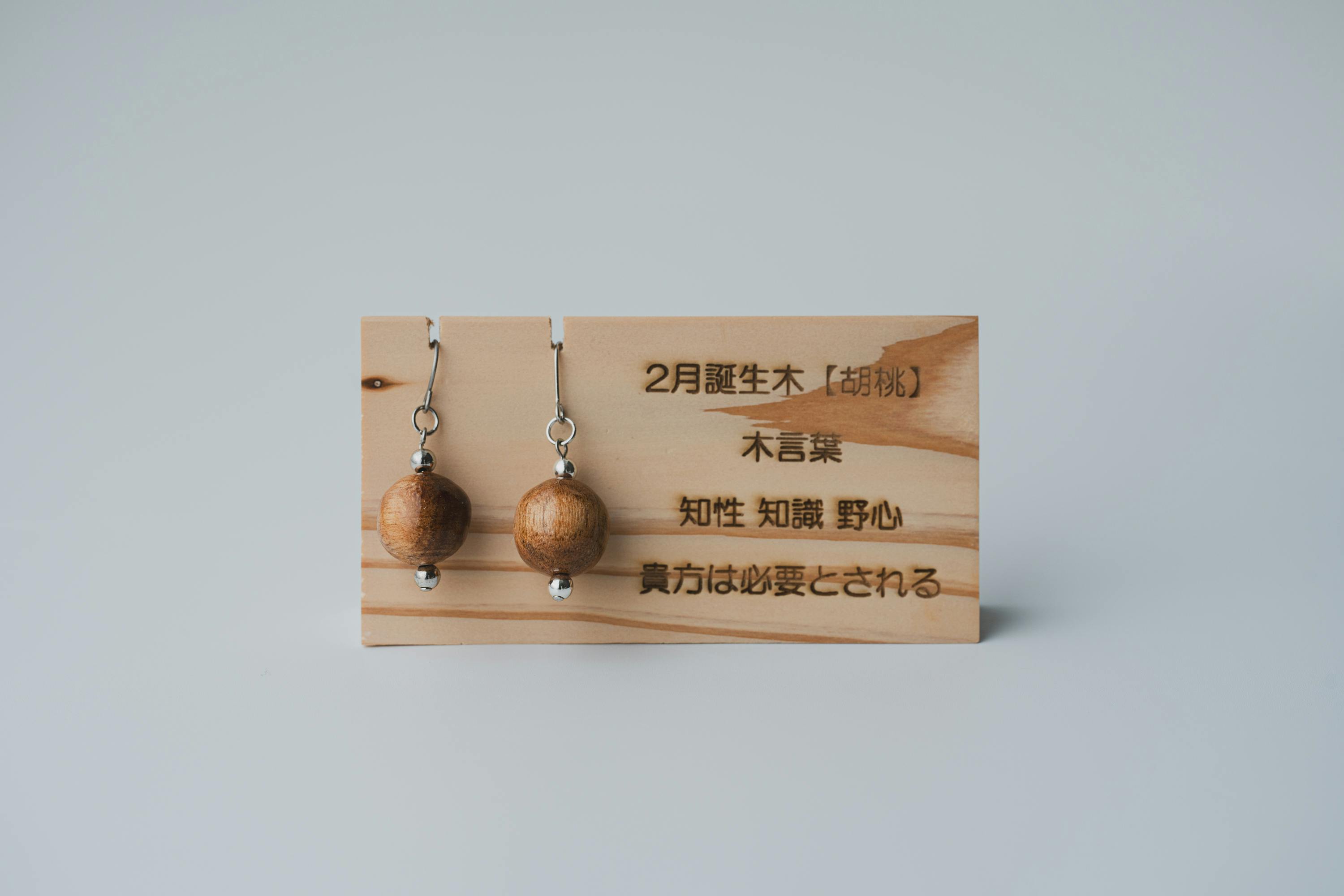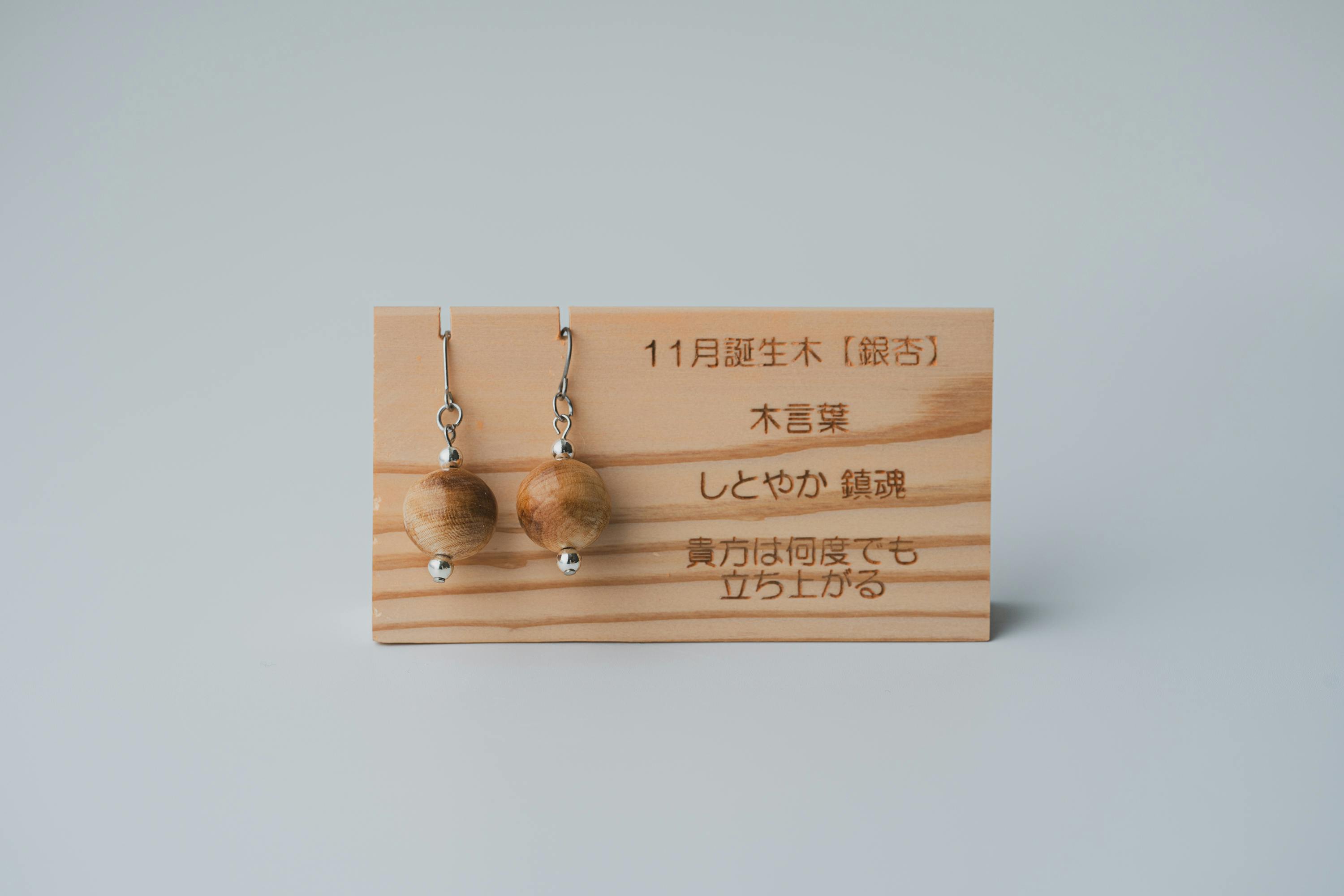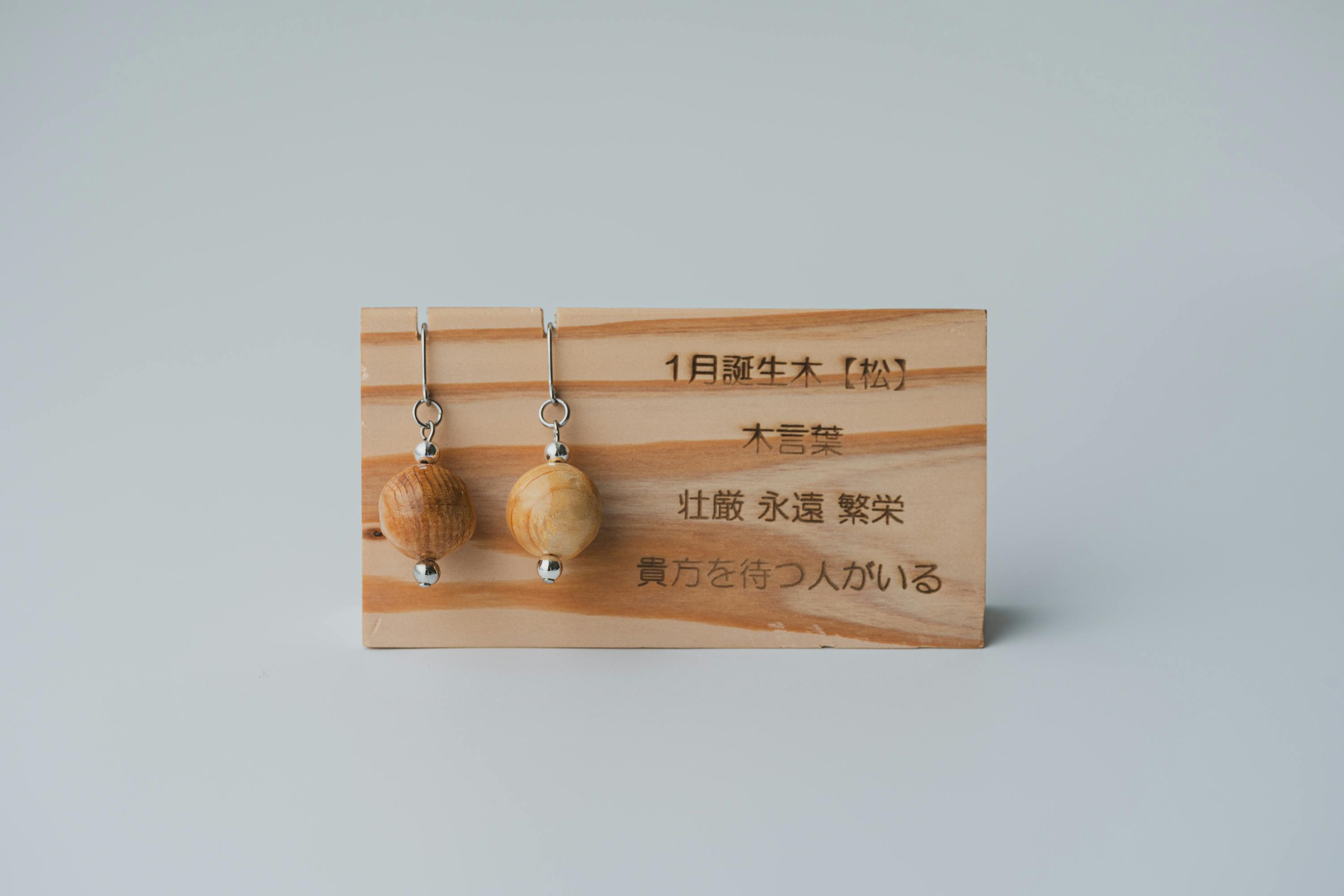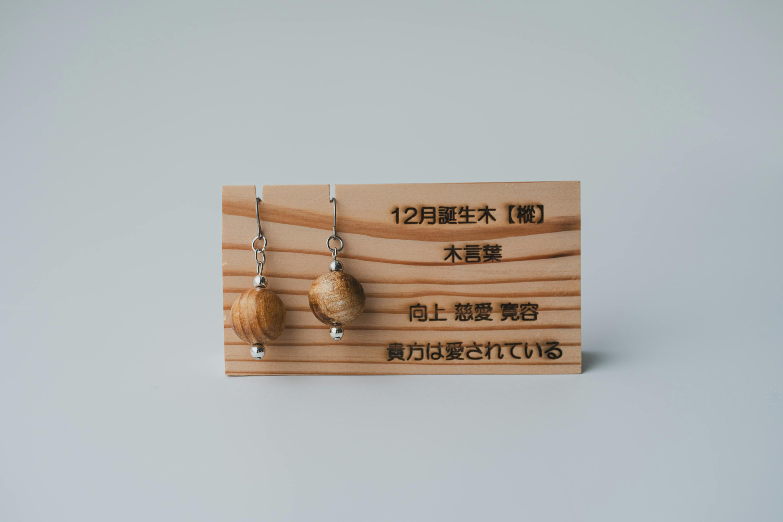 それぞれの生まれ月に対応した12種類の守り木(誕生木)を使用して、シンプルで温かみのあるピアス/イヤリングに仕上げています。