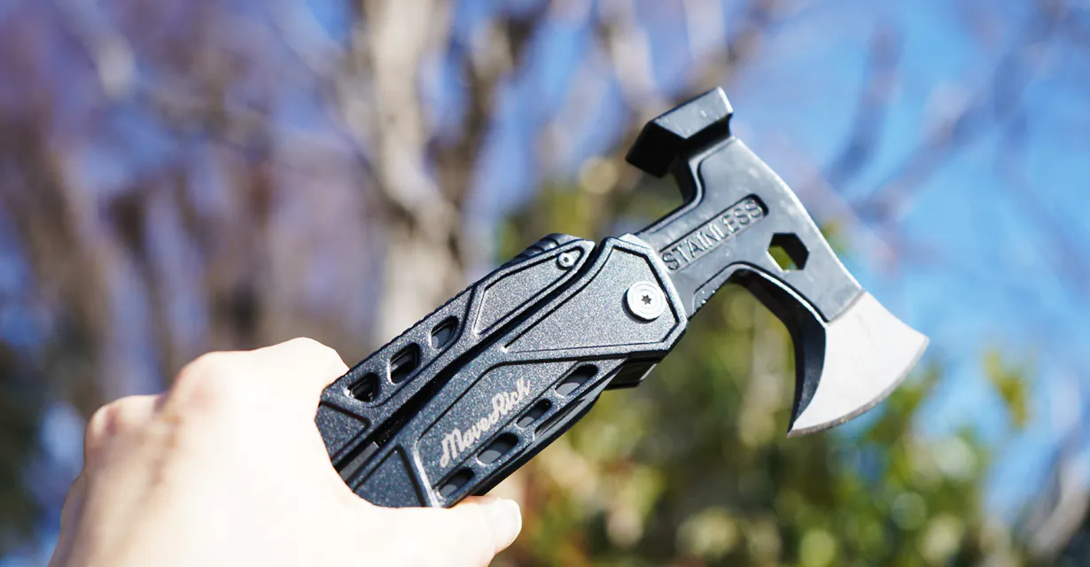 斧とハンマーがメンイのブラックチョッパーは、すべての機能が18種類もありアウトドアや車中泊など荷物を減らしたいときにぴったりな便利ツールです。