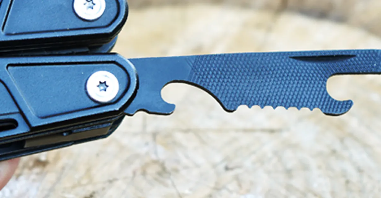 A2:すべての機能を合わせ18機能ございます。斧、ハンマー、六角レンチ、ドライバービット3種、ナイフ、マイナスドライバー、缶切り、両面爪やすり、ロープカッター、栓抜き、のこぎり、セレーションエッジ、スタンダードプライヤー、ラジオペンチ、ホイッスル、ファイアースターターです。