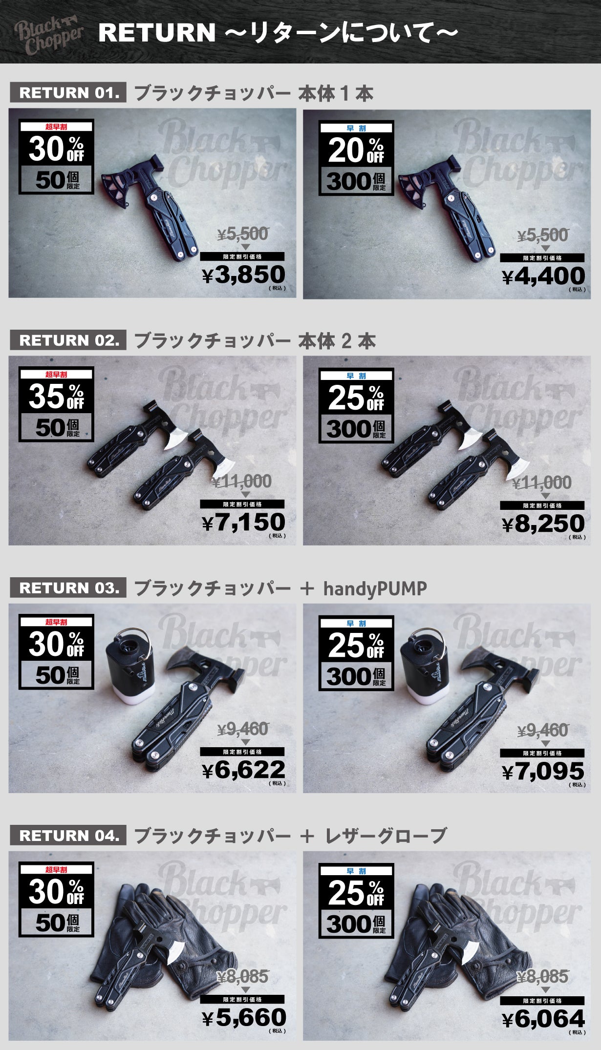 「焚火周りはこれ一本!」いうコンセプトを掲げたブラックチョッパー。