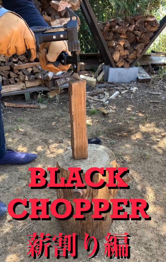 本日はブラックチョッパーのメイン機能である斧を使って薪割りをしているところをご紹介いたします。