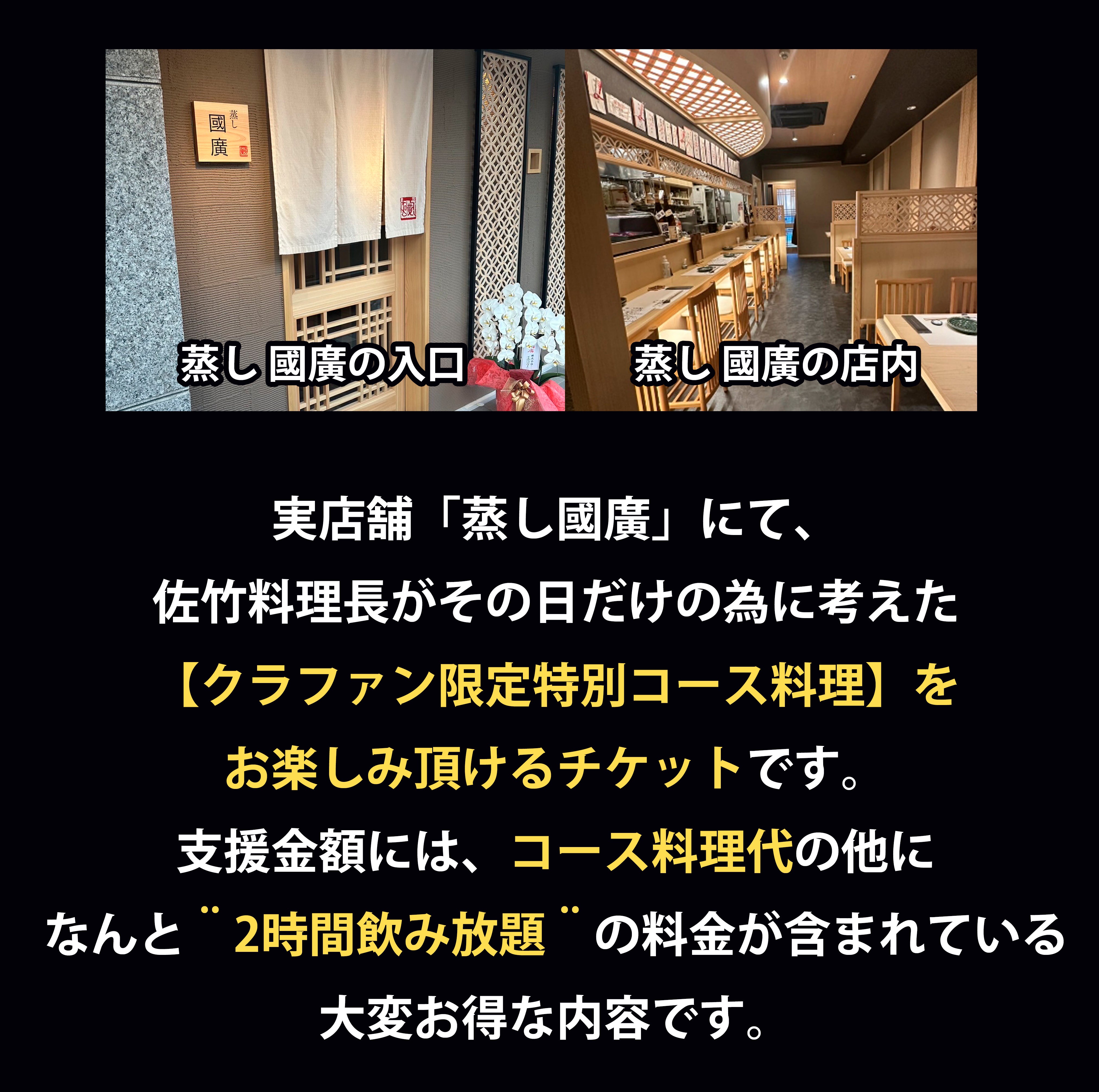 実店舗「蒸し國廣」で、この日だけのクラファン限定 特別コースメニューを楽しめるディナー会への参加チケットです。
