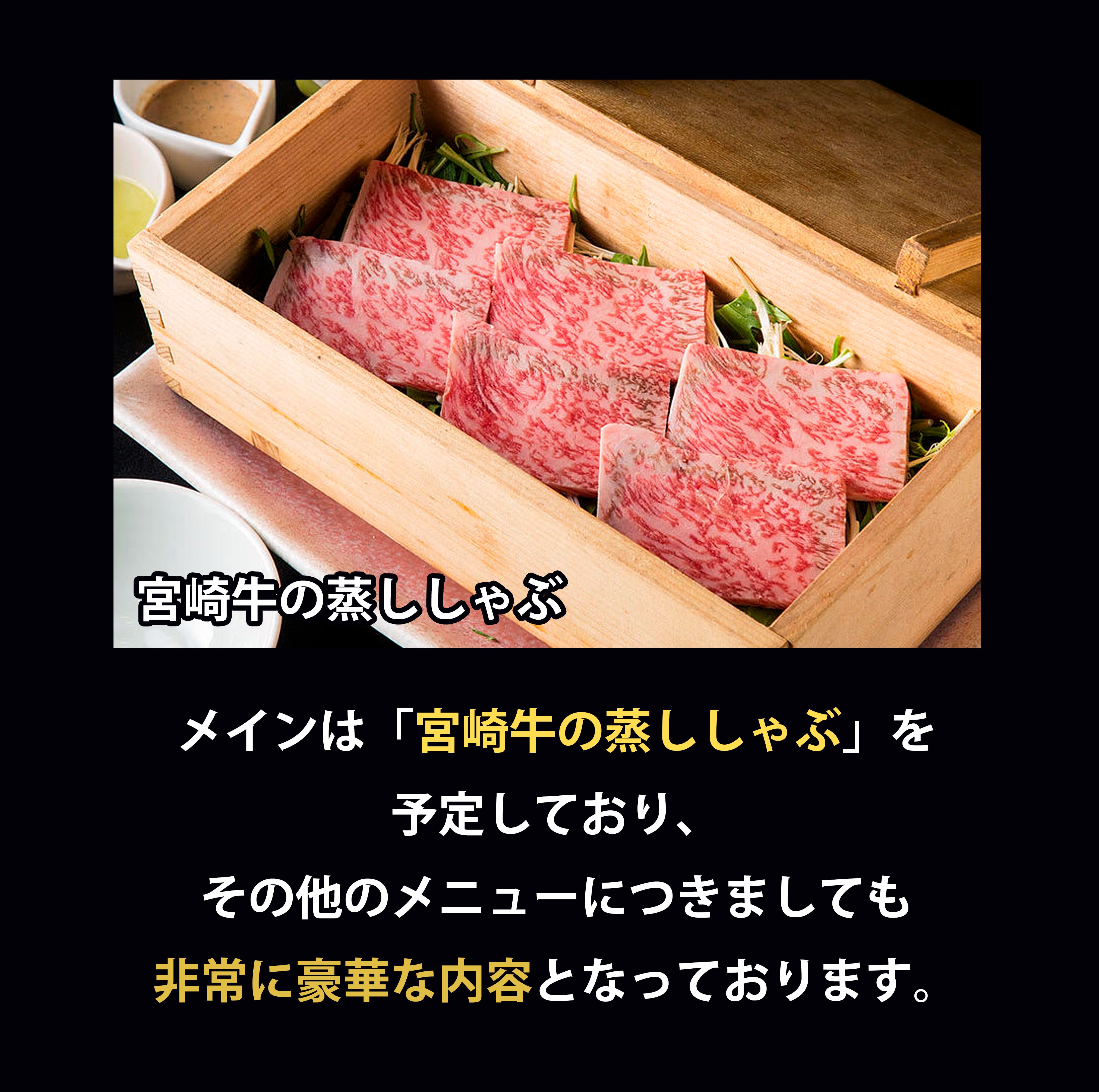 メイン料理には「宮崎牛を使った蒸ししゃぶ」を予定しています。