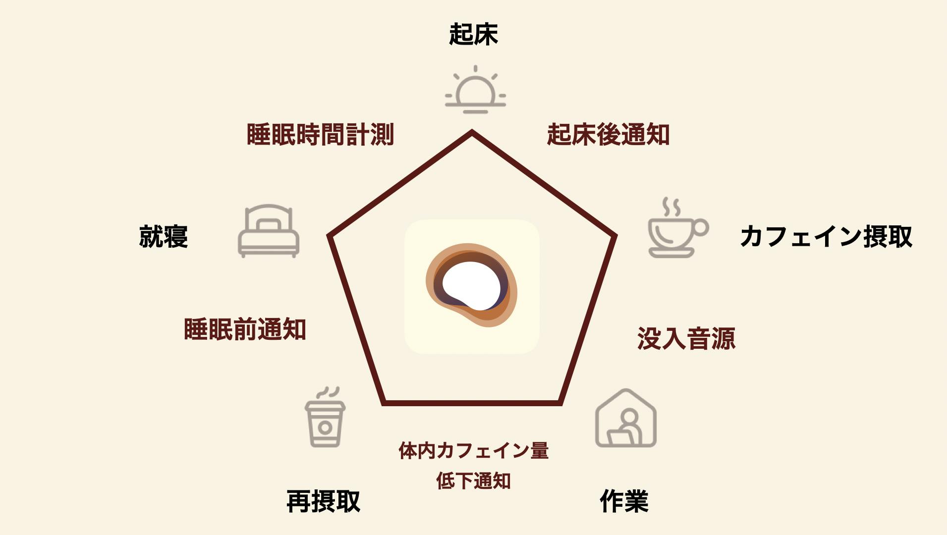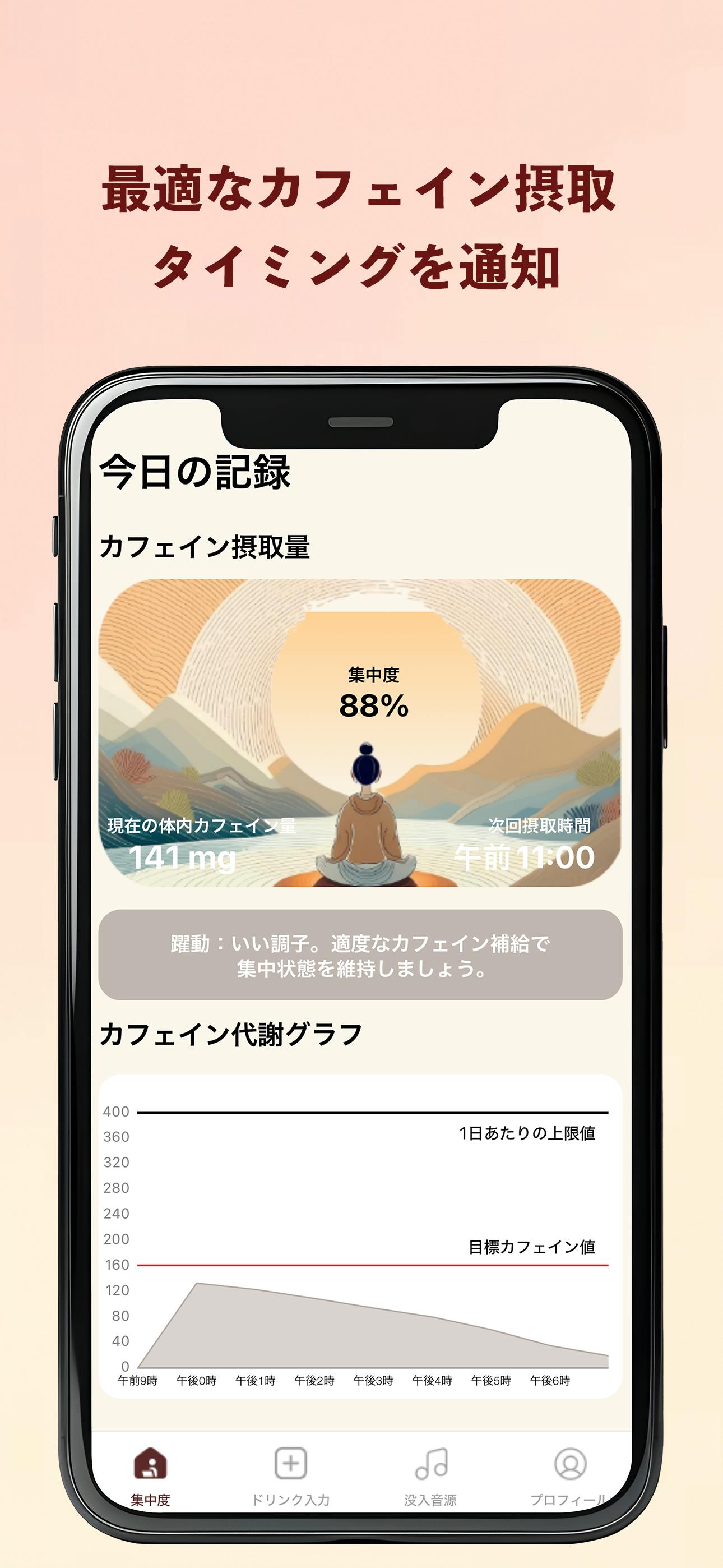 - 独自のカフェイン摂取法&通知:最適化された摂取タイミング通知で、最低限のカフェイン量で最大化の効果を得る