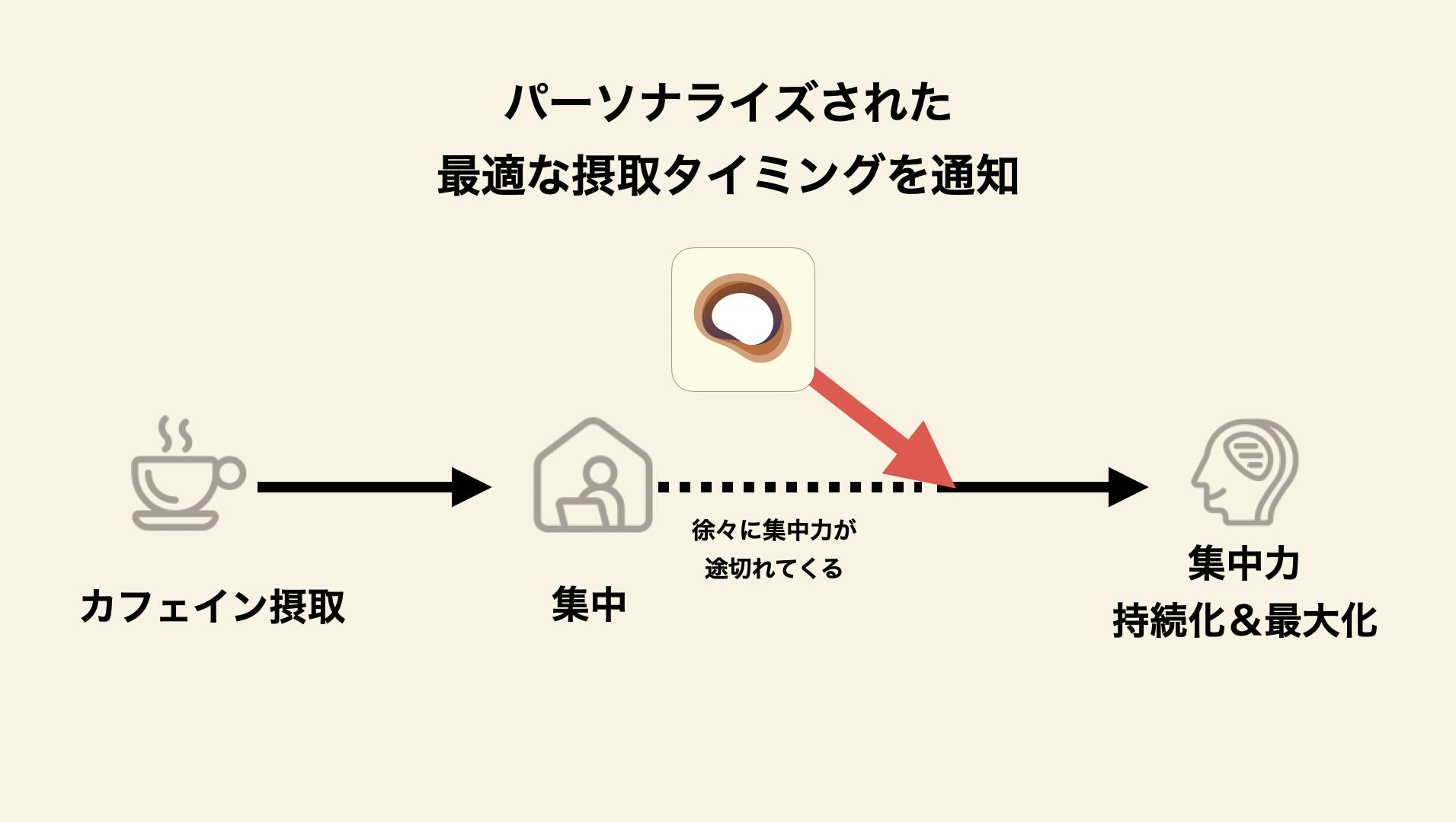 エンジニアとして1日12時間以上働いて、日々パソコンと睨めっこする中で、どうすれば集中力を保ち続けられるのかを自分なりに試行錯誤して、毎日飲んでいたコーヒーから気づきを得て、カフェインの摂取量、タイミングを調節すれば、いつもより長く集中できることにたどり着きました。