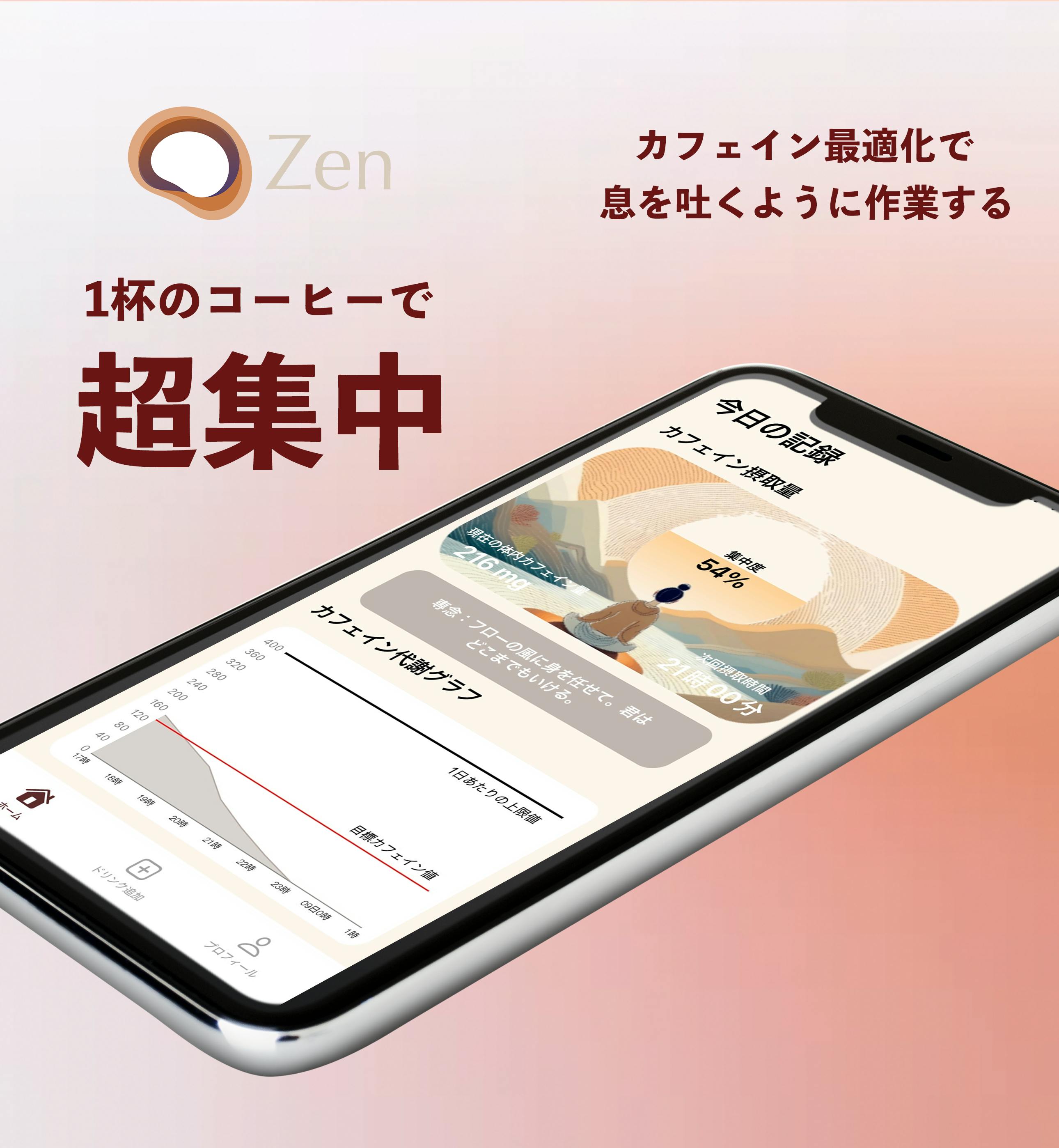 「Zen」とは、カフェインを取るタイミング・量をコントロールすることで集中力を「持続化」「最大化」できるという考え方をもとに、カフェイン飲料を入力するだけで次回カフェインを取るべきタイミングを通知を行うiOSアプリです。