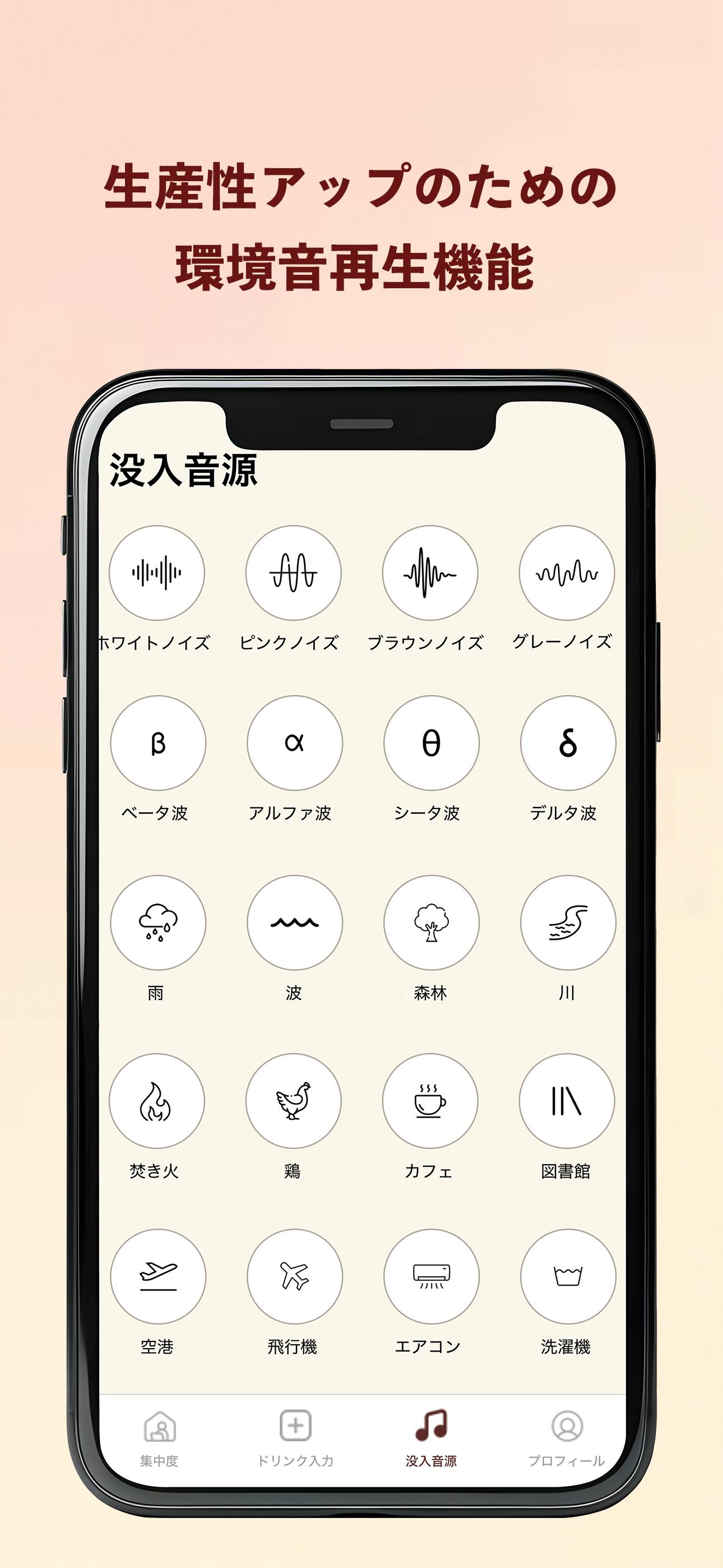 勉強、仕事により没入するための音源再生機能(ノイズ、自然音、BGMなど)