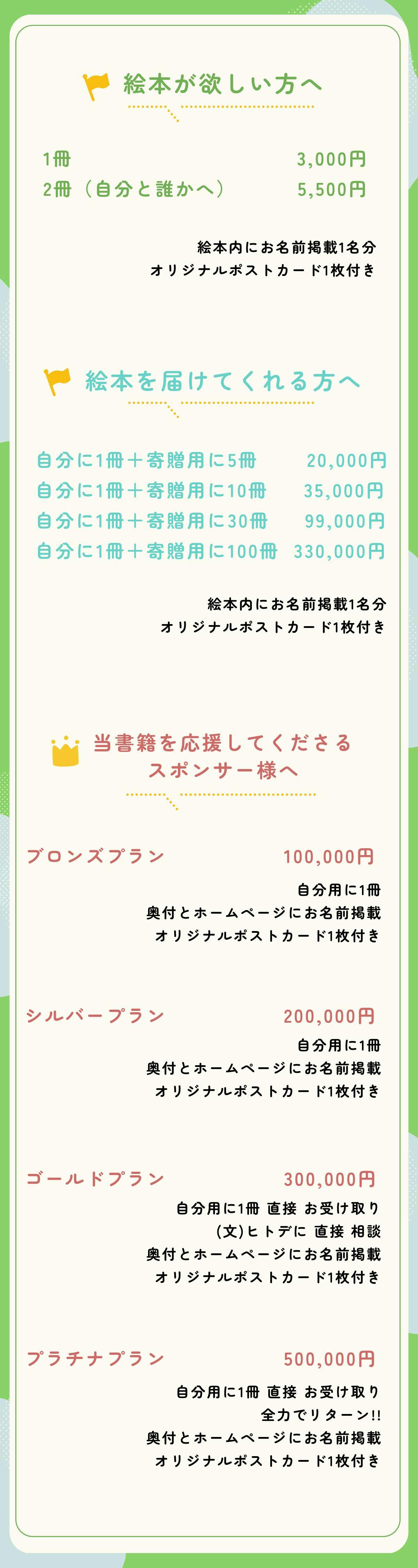 また「絵本そのものは使う予定がなくても、きょうだい児への協力はしたい」という方にも力を貸していただきたく「絵本を届けてくれる方へのリターン」をご用意作成しました。