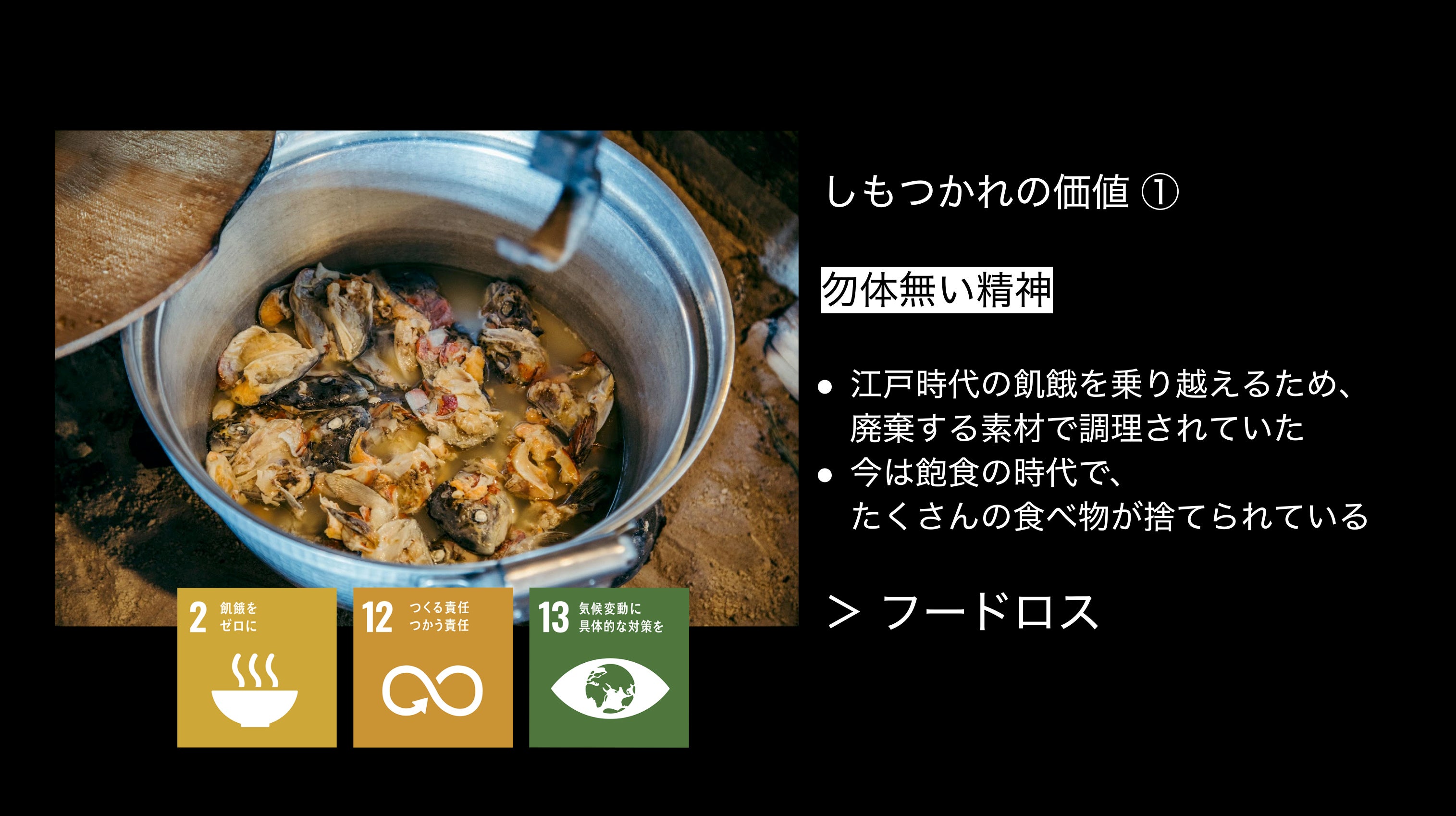 以上の3つの精神性は、SDGsが制定される遥か昔から日本人が大切にしてきた、世界に誇るべき価値観です。「MOTTAINAI」は既に世界中に定着していますが、この精神は「侘び寂び」にも通じる日本の誇る文化として、しもつかれにも体現されています。しもつかれの価値は、もはや栃木だけに留まらず、日本を代表する精神性の高い郷土料理であると言えるでしょう。
