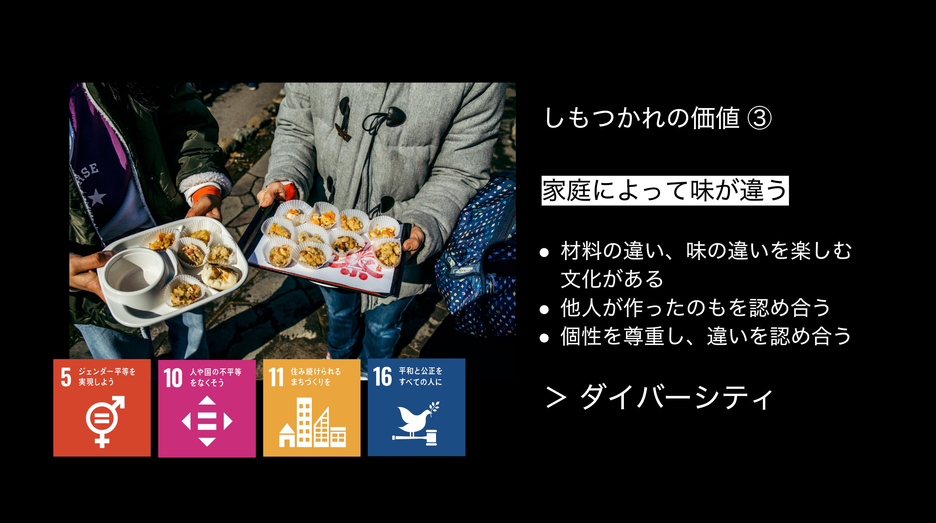 しもつかれの本質的な価値は、「見た目」や「風味」といった表面的な部分ではなく、その背後にある「精神性」にこそあります。私たちは、「3つの精神的価値」を活動の軸としており、これらは「サステナビリティ」や「SDGs」の考え方とも一致しています。