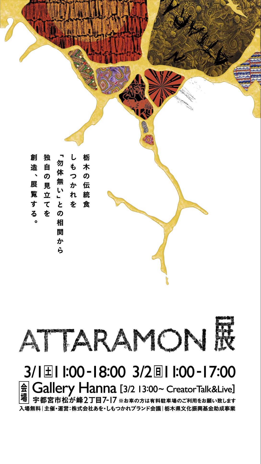 2025/04/15 09:37ATTARAMON展 - あったらもん展-開催のご報告投稿が遅くなりましたが、多数の方からご支援いただきました「ATTARAMON展」を無事に開催することができました。改めましてご支援いただきました皆様に、厚く御礼申し上げます。本当にありがとうございました。今回展示させていただきましたコンテンツと、ライブパフォーマンスについての詳細を記述させていただきます。ご来場いただけなかった方、ぜひご覧ください。CONTNTS:1『しもつかれブランド会議の軌跡』2025.3.1〜3.2の二日間、宇都宮市のGallery Hannaさんで開催したしもつかれの「勿体無い」にフォーカスした展覧会。栃木弁で「勿体無い=あったらもん」と方言することもあり命名しました。入り口付近から、1Fの畳張りのスペースでは、これまでのしもつかれブランド会議の活動の中から生まれた印刷物やパッケージデザイン、洋服、アート作品などから、掲載いただいた、新聞、書籍、雑誌、大学生の卒論として取り上げてもらった論文などの展示。香川大介さんに描いていただいた屏風が空間をジャックします。壁面には、しもつかれの歴史や、しもつかれと勿体無いの相関関係を示す独自研究の結果なども展示。その必然性を読み取っていただきました。これまでの7年間の活動を俯瞰して体感できる機会となり、また、しもつかれの価値を理解していただく展示となりました。ご来場いただいた方々の中には我々の活動を認知していなかった方も多く、「しもつかれこんな風に変化してるなんて知らなかった」「しもつかれ、オシャレになってますね」「しもつかれってアカデミックなんですね」などなどご意見をいただきました。また、「毎年ポスター楽しみにしてます」「活動応援してます」といったお言葉もいただきました。栃木県民に定着するしもつかれイメージの世界線だけでなくこうした潮流もあるのだということをご覧いただける機会となりました。来場者の価値観の転換に立ち会えたのが成果と言えると思います。[主催・運営]株式会社あを, しもつかれブランド会議[設営・コンテンツ生成]Toru Aoyagi, Atsuko Aoyagi, mizumotoOTAhirotsugu, Takefumi Kondou, Moe Nagata, Yumiko Kashiwakura, Akiko Nara, Akiko SuzukiCONTENTS_2『SHIMOTSUKARE COLAR CHART』しもつかれの代名詞といえば「見た目が悪い」。本当にそうでしょうか。しもつかれブランド会議を始めた当初から思ってました。栃木県民の中に刷り込まれてしまった見た目が悪いという価値観。これをグラフィックとしてポジティブにできないかと見立てたのが本企画です。メンバーでもありグラフィックデザイナー仲間の水本氏とアイデアを練り水本氏にデザインいただいた作品。「SHIMOTSUKARE COLOR CHART」完成した多数のしもつかれから色を抽出しグラフィカルにレイアウト。向かって左は、ナンバーごとに個別しもつかれから抽出した色、右側は、それぞれのしもつかれから食材の色を抽出し、食材ごとにグラデーションでまとめたものになっています。それらをつなぎ合わせ、長いドレープのある印刷で優雅に可視化しています。そして中央のタブレットには、グラフィックまでのプロセスを映像化したもの、QRコードからは、実際に色を抽出したしもつかれの写真を見ることができます。https://blok.jp/shimotsukarecolors/このように見るとどうでしょうか。ほぼアースカラーで構成されていますね。昔ながらの自然に近い食材で調理されていることが理解できます。そして美しい。こうしたグラフィックを見ていただくことでしもつかれの美しさに気づいていただけたらという願いも込めてデザインしていただきました。Graphic design:mizumotoOTAhirotsuguMovie:mizumotoOTAhirotsuguWeb:mizumotoOTAhirotsuguDirection:Toru Aoyagi設営:Takefumi KondouCONTENTS_3『アッタらもん』Gallery Hanna 2Fでの展示作品。「勿体無い」とは、ただの節約や再利用の概念ではない。「勿体」とは、物の本質や存在が持つ価値、権威、品位を指し、「勿体無い」とは、それらを失うことを意味する。最も勿体無いもの、それは「生命」と言える。日本では古来より、八百万神の考えのもと、あらゆるものに生命が宿るとされてきた。しかし現代では、フードロスや文化の喪失といった形で、まだ活かせる生命が捨てられている。それとともに、八百万神を感じる感覚も薄れつつある。「山は山であって山でない。故に山である。」この言葉に示されるように、生命とは、要素の集積によって構築されるものだ。生命は、混沌や未規定性、不確実性、偶然性の中から生まれる。完璧な計算から生まれる生命は存在せず、結果として、蓄積されたものが形を成し、生命となる。しもつかれもまた、生命と同じく、混沌、未規定性、不確実性、偶然性そのものである。だからこそ、しもつかれを現代の八百万神として表現できないかと考えた。それは、神なのか、仏なのか、悪魔なのか、鬼なのか──。この具現化の試みとして、「アッタらもん」と名付けた。絶対的な課題解決ツールを持つ某キャラクタ