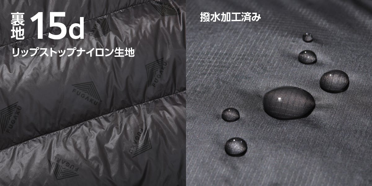 ダウンシュラフを汗や結露等の水分から保護する、撥水加工を施した丈夫なリップストップナイロン生地。表地は20d、FUGAKUロゴをプリントした裏地は薄手の15dで体へのフィット感をアップ。