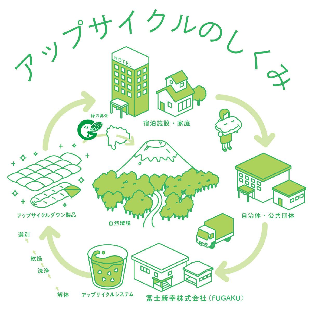 使われなくなった羽毛ふとんを回収、富士山系の伏流水で清潔に洗浄し、高温乾燥してボリュームを蘇らせたアップサイクルダウン(リサイクル羽毛)をたっぷり750g使用しています。フィルパワーは660FPを誇ります。