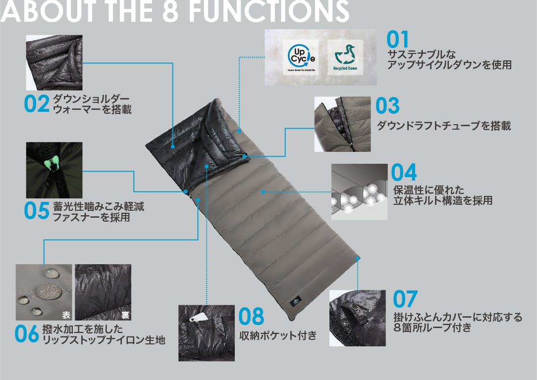 使われなくなった羽毛ふとんを回収、富士山系の伏流水で清潔に洗浄し、高温乾燥してボリュームを蘇らせたアップサイクルダウンを使用した、ふとん感覚で快適な寝心地の「2in1」仕様のダウンシュラフ。