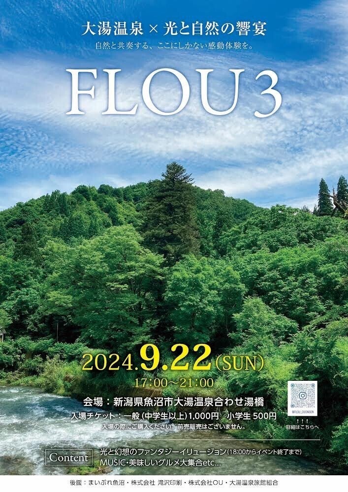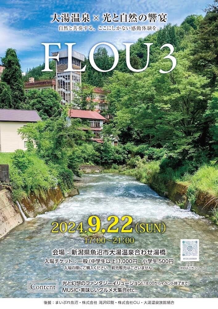 こちらは新潟県魚沼市大湯温泉で9月22日に開催される『FLOU3』実行委員会です。一昨年からはじまったイベントで、去年までは様々なコンテンツを支度してきましたが、今年からは過去2開催で最も注目度が高かったライトアップ・プロジェクションマッピングに特化したイベントに生まれ変わります。開湯1300年の歴史を誇る大湯温泉で、レトロでひなびた温泉街風景を一夜だけ、光に包まれた幻想的な街に変えてみたいと思ってます。