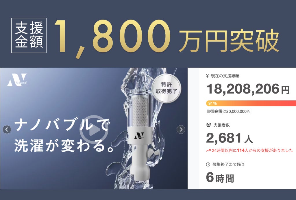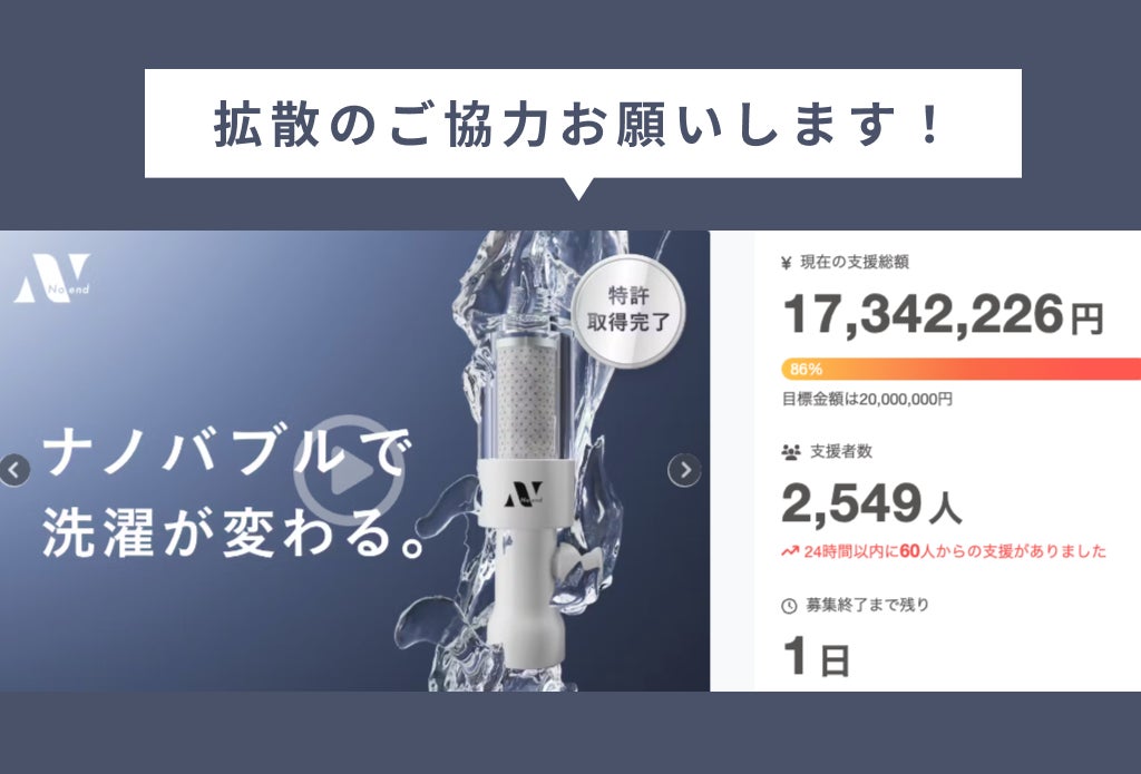 こんにちは。株式会社No.でございます。皆様からの温かいご支援のおかげで、達成率86%まで到達することができました。心より御礼申し上げます。また、Noend洗濯アダプターの生産は順調に進んでおり、11月末より皆様のお手元にお届けする予定です。プロジェクトを100%達成するために、ぜひプロジェクトページを皆様のSNSなどでシェアしていただけますと幸いです!!【ご支援の締め切りは10月31日 23時59分まで】https://camp-fire.jp/projects/780726/view