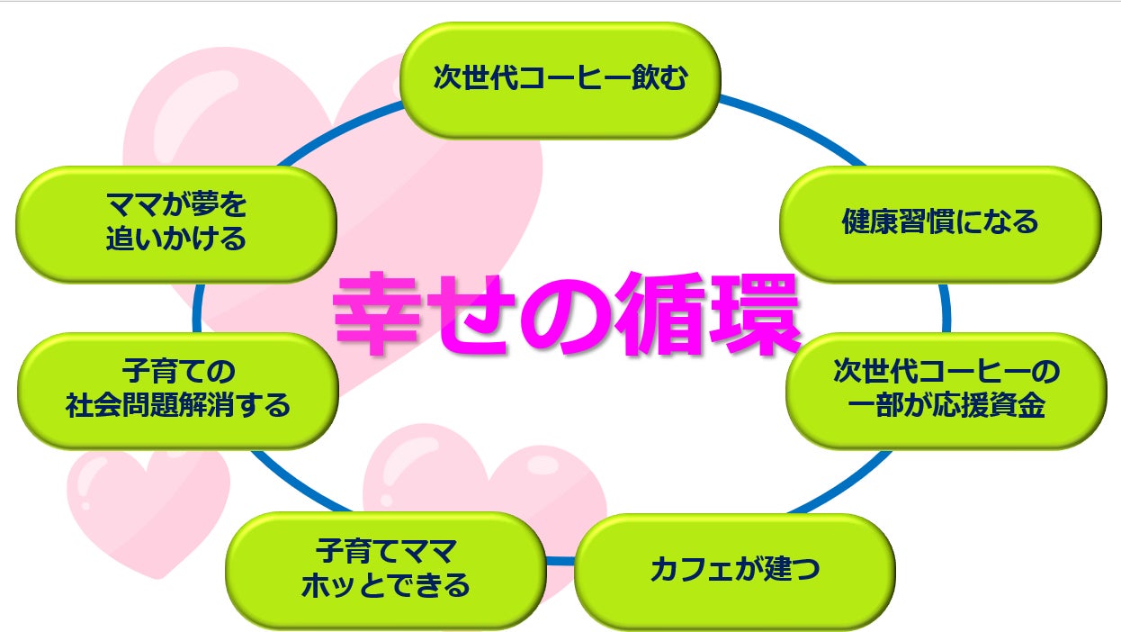 TUNAGI Coffeeを毎日飲むだけで、日々の健康習慣になり、資金が集まり、【4つのOKカフェ】が建つ!みんなが得する、幸せな循環です。この循環に参加する人をどんどん増やしたい!このプロジェクトの目的は、そこにあるのです。