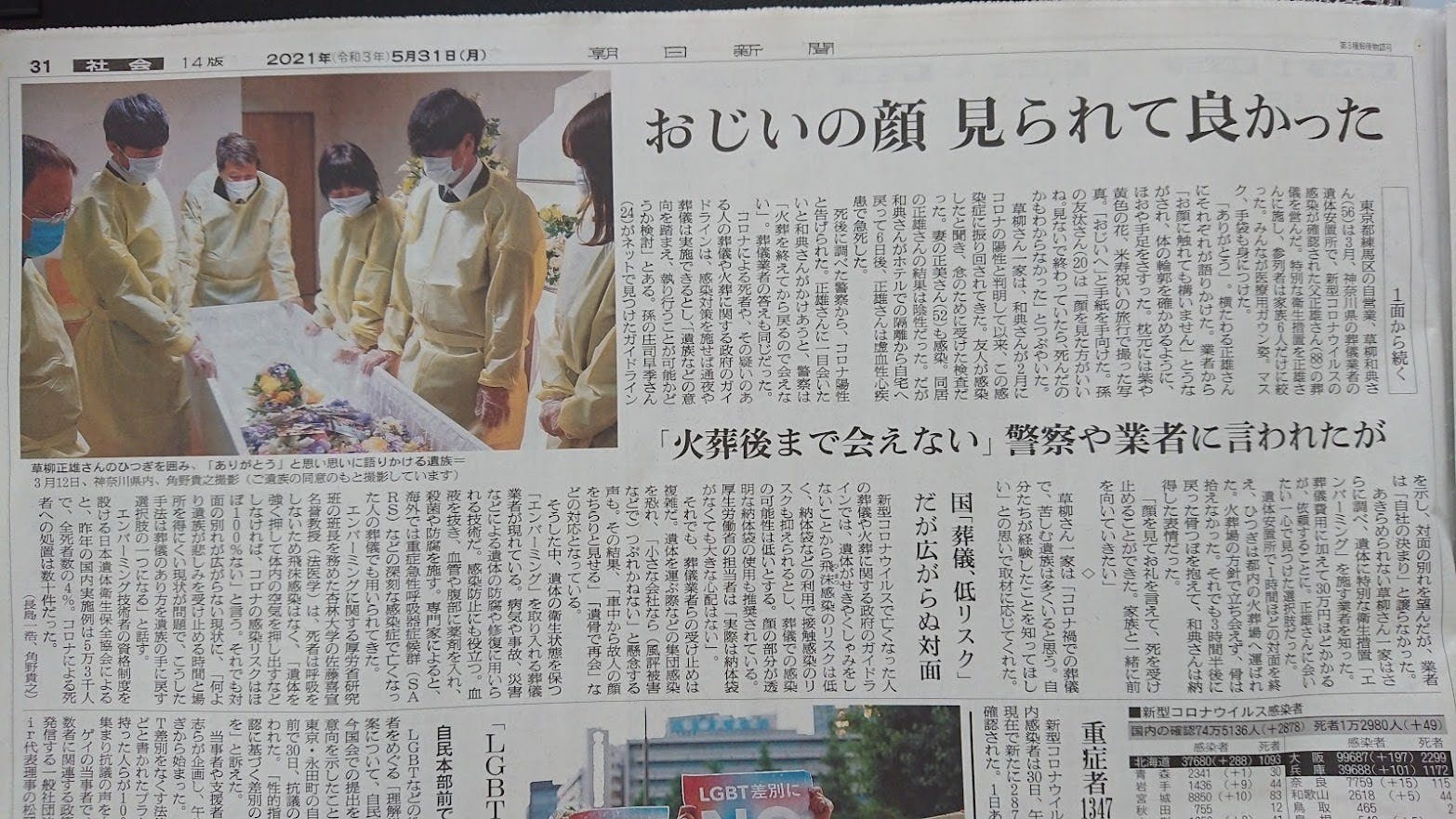 さらに奇跡だったのが、コロナ陽性患者の葬儀について、とある新聞社が取材先を探していたことでした。当時は8割の人が対面でお別れができないという状況だったそうで、うちの話を聞いて、取材したいという申し出をいただいたのです。
