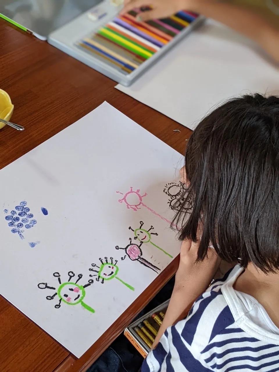 夏休みに開催する親子麹教室にて想像力豊かに麹菌を描く子。
