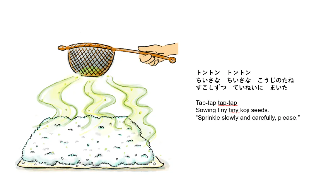 ・絵本を通して、実際の麹作りのプロセスを再現しています。