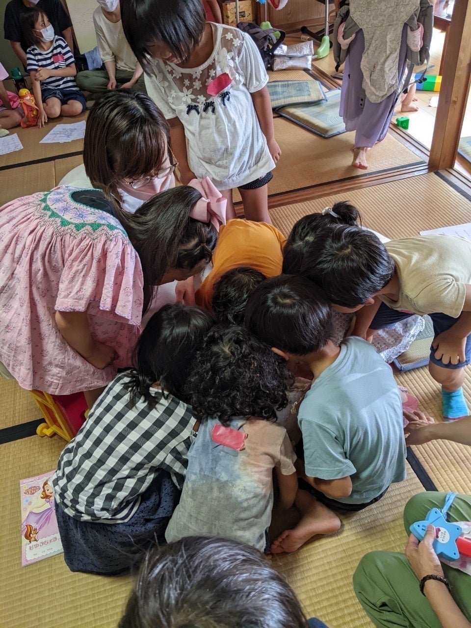 絵本を読んだ後、麹を見せると興味津々。麹を囲んで集まる子どもたち。