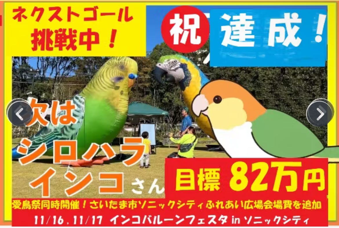 2024/09/16 09:31この度は、シロハラインコバルーン製作のクラウドファンディングを応援・ご支援いただき、本当にありがとうございます!おかげさまで、当初の目標63万円を達成して、シロハラインコバルーン製作することができます!(祝)また、ネクストゴールとして、11/16,11/17 さいたま市で開催するイベント「インコバルーンフェスタ in ソニックシティ」の会場使用料 18万円を追加して、ネクストゴール82万円として、みなさまの応援、ご支援をいただきました。最終は、749,000円 当初目標の118%という、すばらしい結果になりました!本当にありがとうございます。みなさまの想いが、たくさん集まって生まれたシロハラインコバルーンさんは、きっと、多くの人々に愛されて、動物愛護のメッセージを伝えていけると思います!今からが、また、大本番です!鳥さんの世界がもっと、もっと良くなるように、啓発活動をがんばっていきます!今後とも、どうぞ、よろしくお願いいたします!NPO法人ハッピーインコ 芳賀秀樹 もっと見る