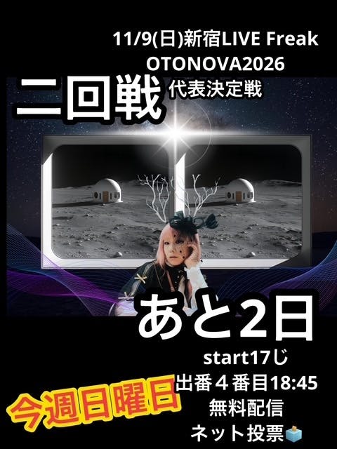 蓮音まゆ挑戦2025ラストスパート 勝利か敗退か 応援よろしくおねがいします!あと2日、コンテストOTONOVA2026に蓮音まゆ挑戦しています。二回戦‼  正直、かなり厳しいです。ご来場できそうな方よろしくお願いします。でもご来場できないけど、ネットから投票が出来ます。OTONOVA投票券を買って応援出来そうな方、ご検討よろしくお願いします。今週日曜日 蓮音まゆコンテスト挑戦の二回戦‼リスナー様の投票により勝ち抜きが決まります。ご来場ドタ参加できる方、お待ちしています。 11/9(日)新宿LIVE Freak OTONOVA2026 代表決定戦開催日程(2回戦)■ OPEN:16:30■ START:17:00■ TICKET:前売り2500円 当日3000円■ 勝抜:2組蓮音まゆは、4番目18:45です‼無料配信&投票ページができました‼ご来場、または、ネットから投票できますこちらから、無料配信が観れて、投票ができます。https://mudia.tv/event/4622 投票期間:11/09 17:00 〜 11/09 24:00 まで、勝抜 2組投票ルール詳細はこちらhttps://mudia.tv/vote_method/otonova2026_live ★投票は一回戦とルール同じ★ ①無料ポイント 最大5000ptまで②有料ポイント 3000G(3300円でGを買い、イベント開始時間にOTONOVA応援ギフトに交換)それ以外、それ以上もそれ以下も課金、有料ポイントは、使えない。イベント一回につき、一回のみ③ライブハウスご来場者だけがもらえる金の投票券のみっつのみ。 ⚠もし、ご来場できない方でも無理ない程度に、応援できそうな方はOTONOVA応援ギフトを買って応援してくださると助かります。無料ポイントのみ投票も可能です。▶︎OTONOVA応援ギフトを買ってくださる方へ、またはライブハウスご来場で金の投票券で投票する方買い方 蓮音まゆによる説明 https://youtube.com/shorts/uoqZeaY8w48?si=4CKRsFE9lMbKJLYU 二回戦は、サポートメンバーつきます。vo.g 蓮音まゆkey Matthewdrums かまだあき ライブ予約チケット購入https://hasunemayu.booth.pm/取り置き予約蓮音まゆライブ予約フォームhttps://ssl.form-mailer.jp/fms/7bd254c1777057特設サイト蓮音まゆOTONOVA2026 まとめhttps://hasunemayu.jimdofree.com/2025-26otonova2026challenge/ライブハウス新宿 Live Freakhttps://live-freak.jpACCESS〒160-0022東京都新宿区新宿2-12-4 アコード新宿ビルB1FTEL:03-3351-7542FAX:03-3351-7535・新宿三丁目駅(都営新宿線/副都心線/丸ノ内線)からなら、[C8出口](BIGSビル内)を左に出て徒歩1分!アコード新宿ビルB1F。(1Fにはラーメン屋さんが2軒( [品川製麺所] と [壱角家] )があります)・JR新宿駅からは徒歩8分。 新宿駅東口を出る↓新宿通り(アルタ前の道)を御苑方向(アルタに向かって右)に直進↓世界堂がある『新宿二丁目交差点』を左折↓世界堂斜め向かいのセブンイレブンより50m先のアコード新宿ビルB1F。(1Fにはラーメン屋さんが2軒( [品川製麺所] と [壱角家] )があります)
