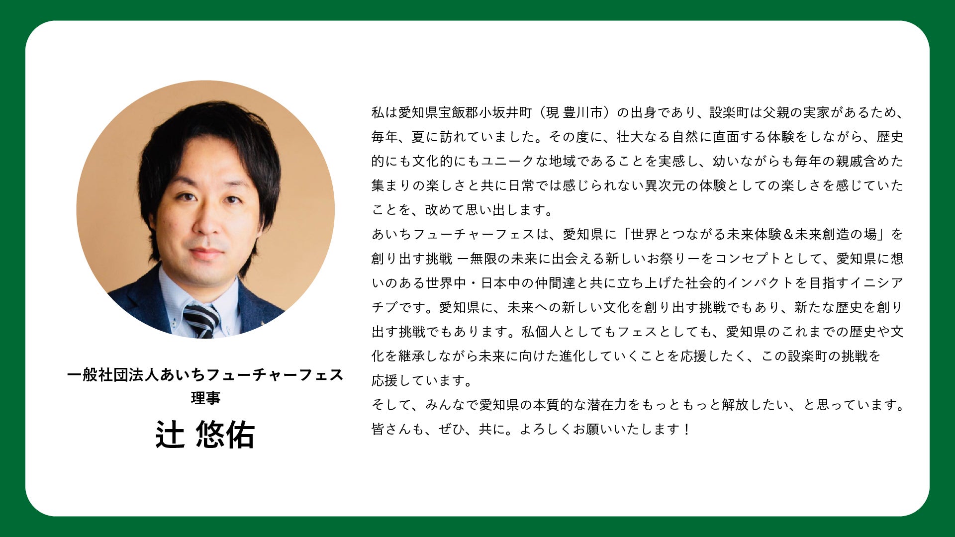 2024/09/30 18:51たくさんのご支援ありがとうございます!このたび応援コメントをいただきましたのでご紹介いたします。一般社団法人あいちフューチャーフェス 理事辻悠佑様私は、愛知県宝飯郡小坂井町(現 豊川市)の出身であり、設楽町は父親の実家があるため、毎年、夏に訪れていました。その度に、壮大なる自然に直面する体験をしながら、歴史的にも文化的にもユニークな地域であることを実感し、幼いながらも毎年の親戚含めた集まりの楽しさと共に日常では感じられない異次元の体験としての楽しさ、を感じていたことを、改めて思い出します。あいちフューチャーフェスは、愛知県に「世界とつながる未来体験&未来創造の場」を創り出す挑戦 -無限の未来に出会える新しいお祭り-をコンセプトとして、愛知県に想いのある世界中・日本中の仲間達と共に立ち上げた社会的インパクトを目指すイニシアチブです。愛知県に、未来への新しい文化を創り出す挑戦でもあり、新たな歴史を創り出す挑戦でもあります。私個人としてもフェスとしても、愛知県のこれまでの歴史や文化を継承しながら未来に向けた進化していくことを応援したく、この設楽町の挑戦を応援しています。そして、みんなで愛知県の本質的な潜在力をもっともっと解放したい、と思っています。皆さんも、ぜひ、共に。よろしくお願いいたします!残り31日ですが、まだまだたくさんの方にこの取り組みを知っていただけるように活動していきたいと思います。引き続きよろしくお願いいたします! もっと見る