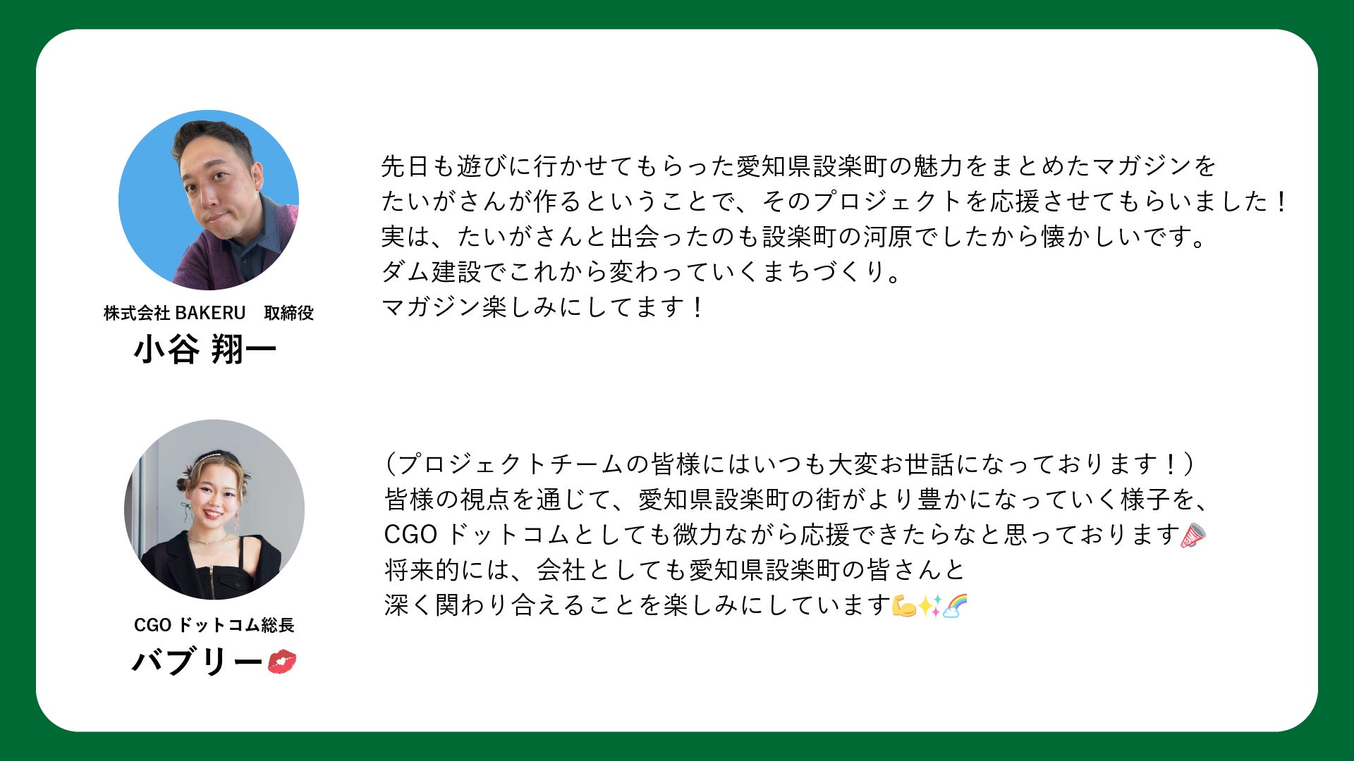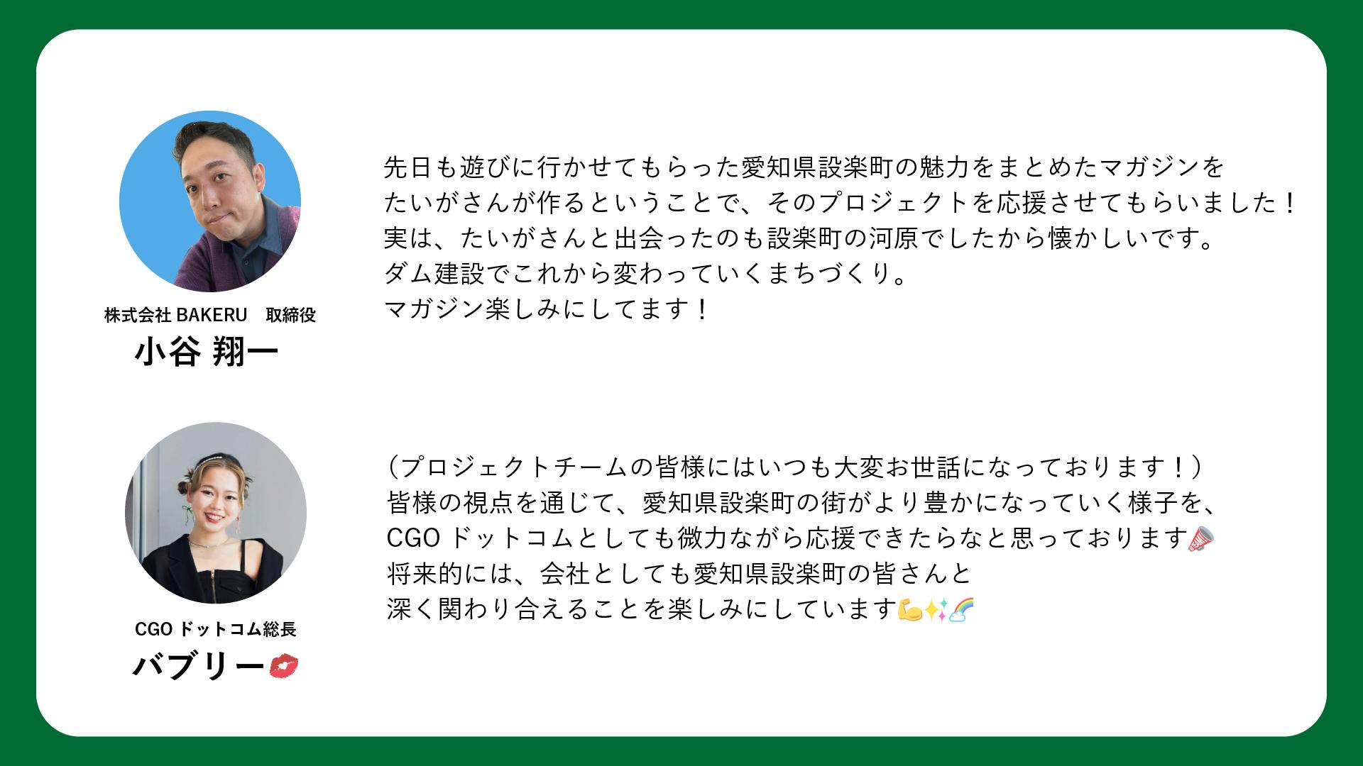 2024/10/11 15:59たくさんのご支援ありがとうございます!このたび応援コメントをいただきましたのでご紹介いたします。------------------------------------------------------------------------------------株式会社BAKERU 取締役小谷翔一様先日も遊びに行かせてもらった愛知県設楽町の魅力をまとめたマガジンをたいがさんが作るということで、そのプロジェクトを応援させてもらいました!実は、たいがさんと出会ったのも設楽町の河原でしたから懐かしいです。ダム建設でこれから変わっていくまちづくり。マガジン楽しみにしてます!------------------------------------------------------------------------------------------------------------------------------------------------------------------------CGOドットコム 総長バブリー 様(プロジェクトチームの皆様にはいつも大変お世話になっております!)皆様の視点を通じて、愛知県設楽町の街がより豊かになっていく様子を、CGOドットコムとしても微力ながら応援できたらなと思っております将来的には、会社としても愛知県設楽町の皆さんと深く関わり合えることを楽しみにしています------------------------------------------------------------------------------------残り20日ですが、まだまだたくさんの方にこの取り組みを知っていただけるように活動していきたいと思います。引き続きよろしくお願いいたします! もっと見る