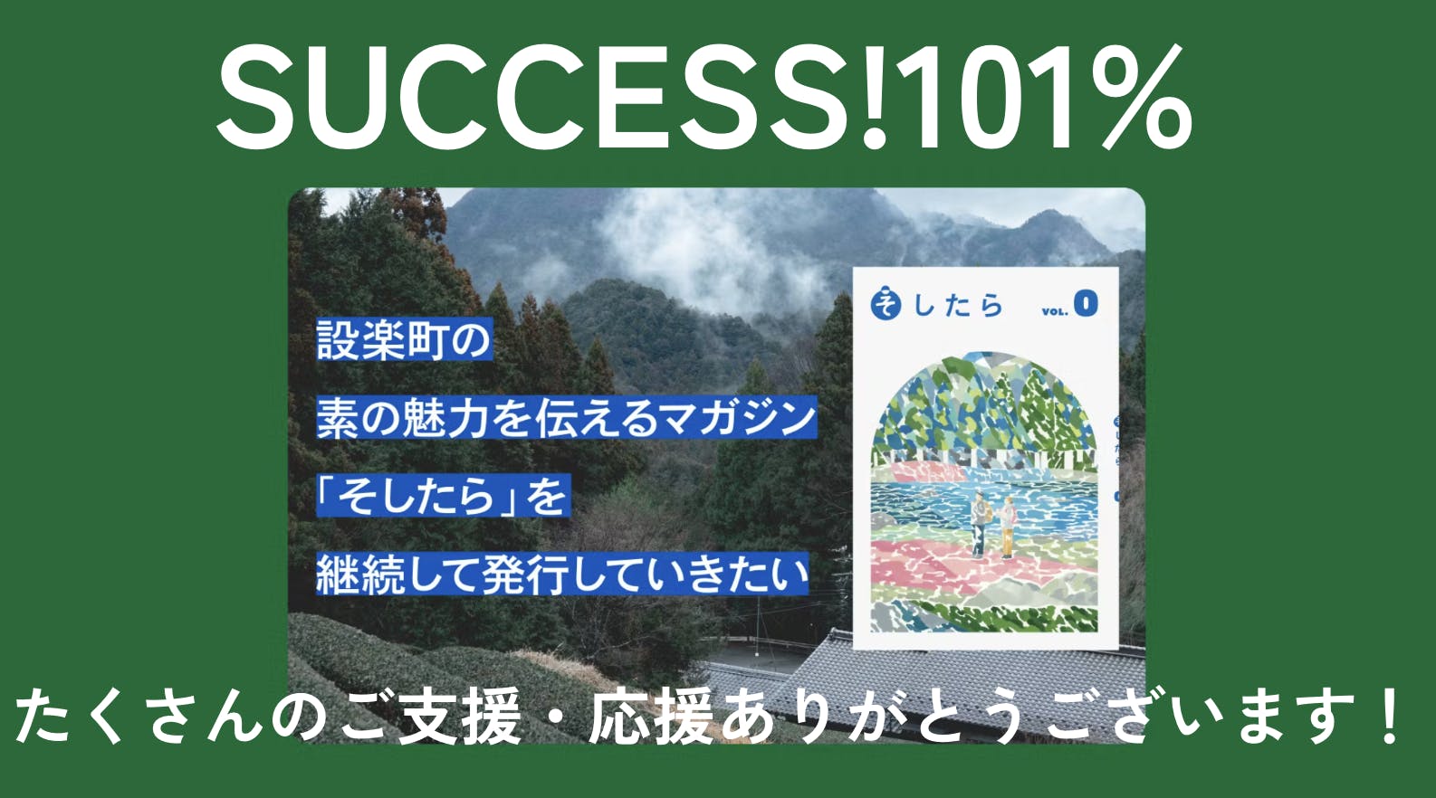 2024/11/01 13:49\たくさんのご支援ありがとうございます!!/クラウドファンディング目標金額達成しました!10/31までの期限でチャレンジしておりました「設楽町の素の魅力を届けるマガジン「そしたら」を継続して発行していきたい」のクラウドファンディングですが、47名の方より101万円のご支援をいただき、無事目標金額を達成することができました!これも応援・支援してくださったすべての方のおかげと、感謝の気持ちでいっぱいです。重ねてありがとうございます!マガジンの発行はもちろんですが、まだはじまったばかりのこのプロジェクト・設楽町のことをクラファンを通じて多くの方に知っていただけたことも大きな成果だと感じております。わたしたちのアクションはこの「そしたら」発行がおわりではなく、ここからはじまっていくと感じております。みなさんの応援・ご支援を糧に、引き続き設楽町でのプロジェクトとして邁進していきます。引き続きチェックもいただけますと幸いです!今後の展開もどうぞご期待ください!!ありがとうございました!!https://camp-fire.jp/projects/780859/view もっと見る