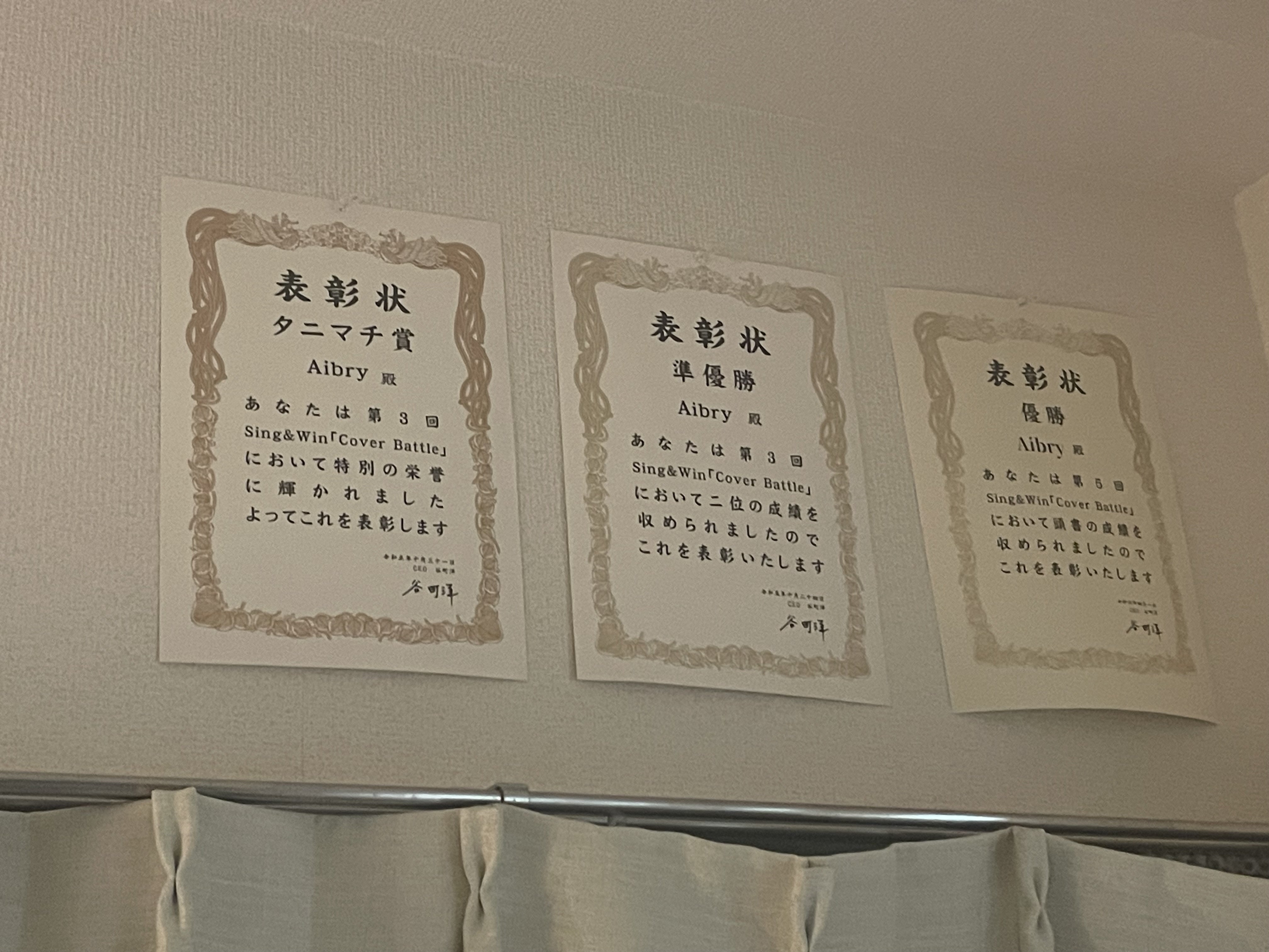 3枚のカバーバトルの賞状を見て、妙に感動しました。