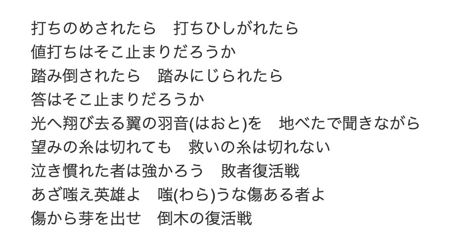 惜しくも優勝を逃したアーティストさんに、敬愛する中島みゆきさんの曲「倒木の敗者復活戦」の歌詞を贈ります。