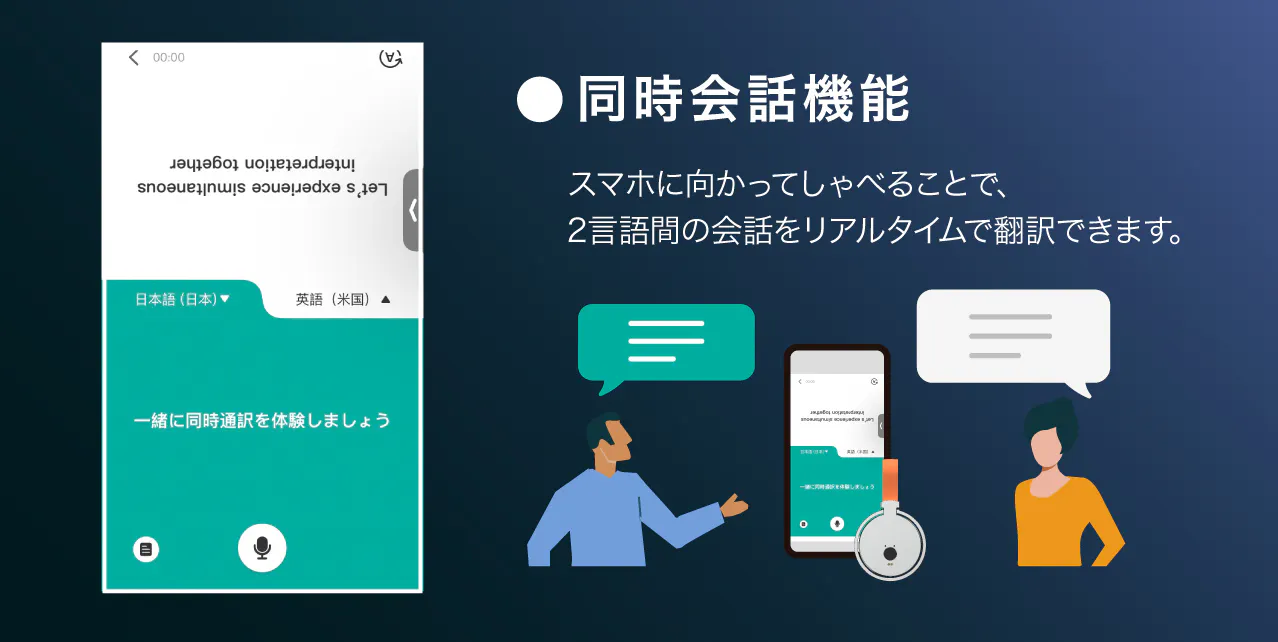 「同時会話機能」は、それぞれの話者がそれぞれの言語で会話をする内容を翻訳し、2画面に分割された画面に表示していく機能です。