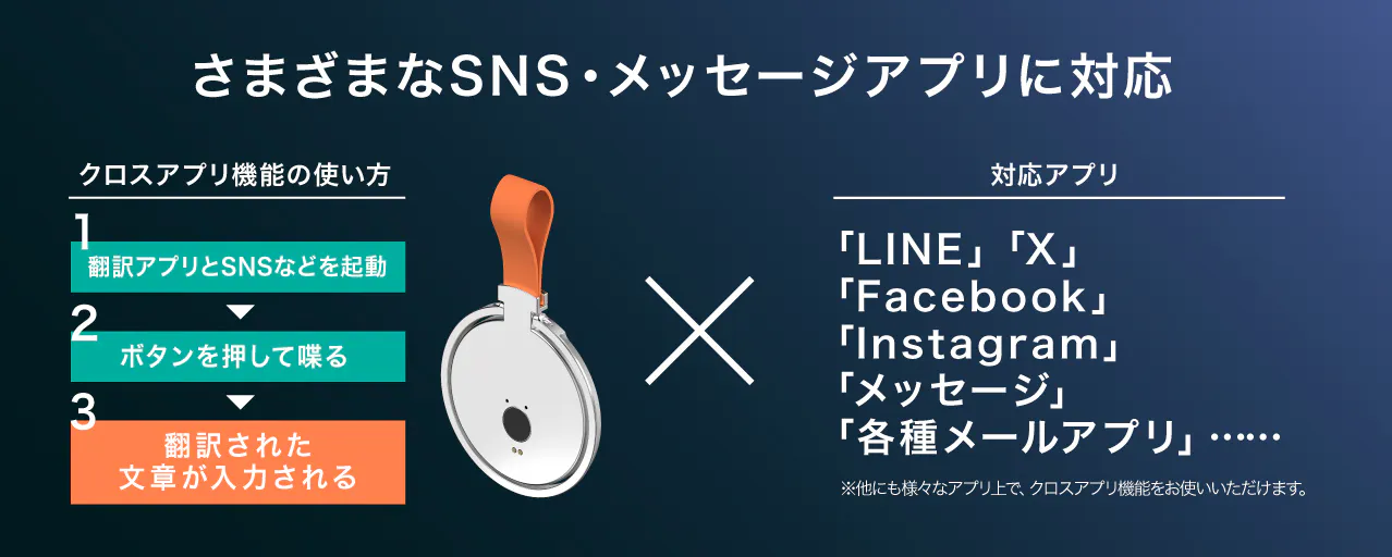 「クロスアプリ機能」は、スマートフォンで別のアプリケーションを利用している際に、「Trans Plate」のボタンを押しながら発話をすることで、その内容が翻訳された文章を音声入力をすることができる機能です。